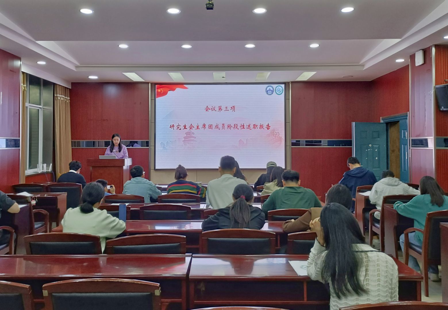 最后,研究生会执行主席孟春妍向各位与会代表进行了研究生会阶段性的工作总结。孟春妍同学汇报了研究生会在上一阶段工作方面的成果,并就下一阶段研究生会的活动组织计划作了说明。