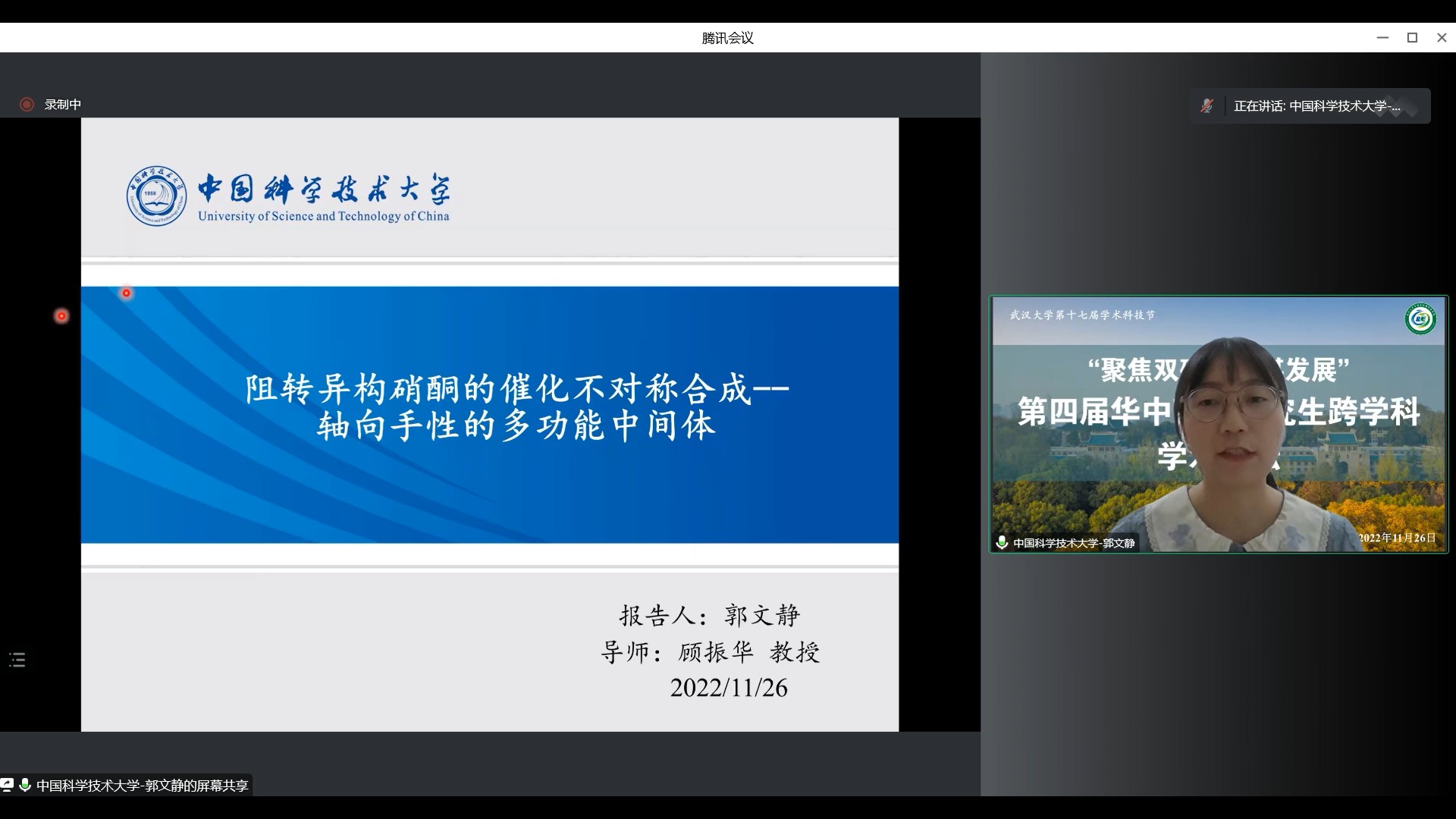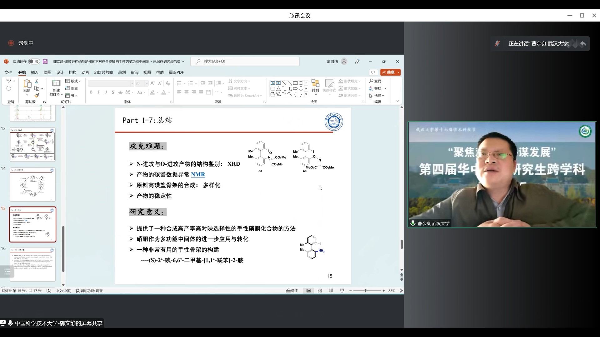 之后进行分享的是来自中国科学技术大学化学与材料科学学院的郭文静同学,报告题目为“阻转异构硝酮的催化不对称合成:轴向手性的多功能中间体”。郭同学报告了一种廉价金属铜催化的高碘盐不对称开环反应,阐述了一种阻转异构硝酮高效合成的方案。反应得到的光学活性硝酮,可将其进一步转化为多种功能化的有机骨架。曹老师肯定了郭同学的研究成果,并建议其着重强调配体选择机制和原理。
