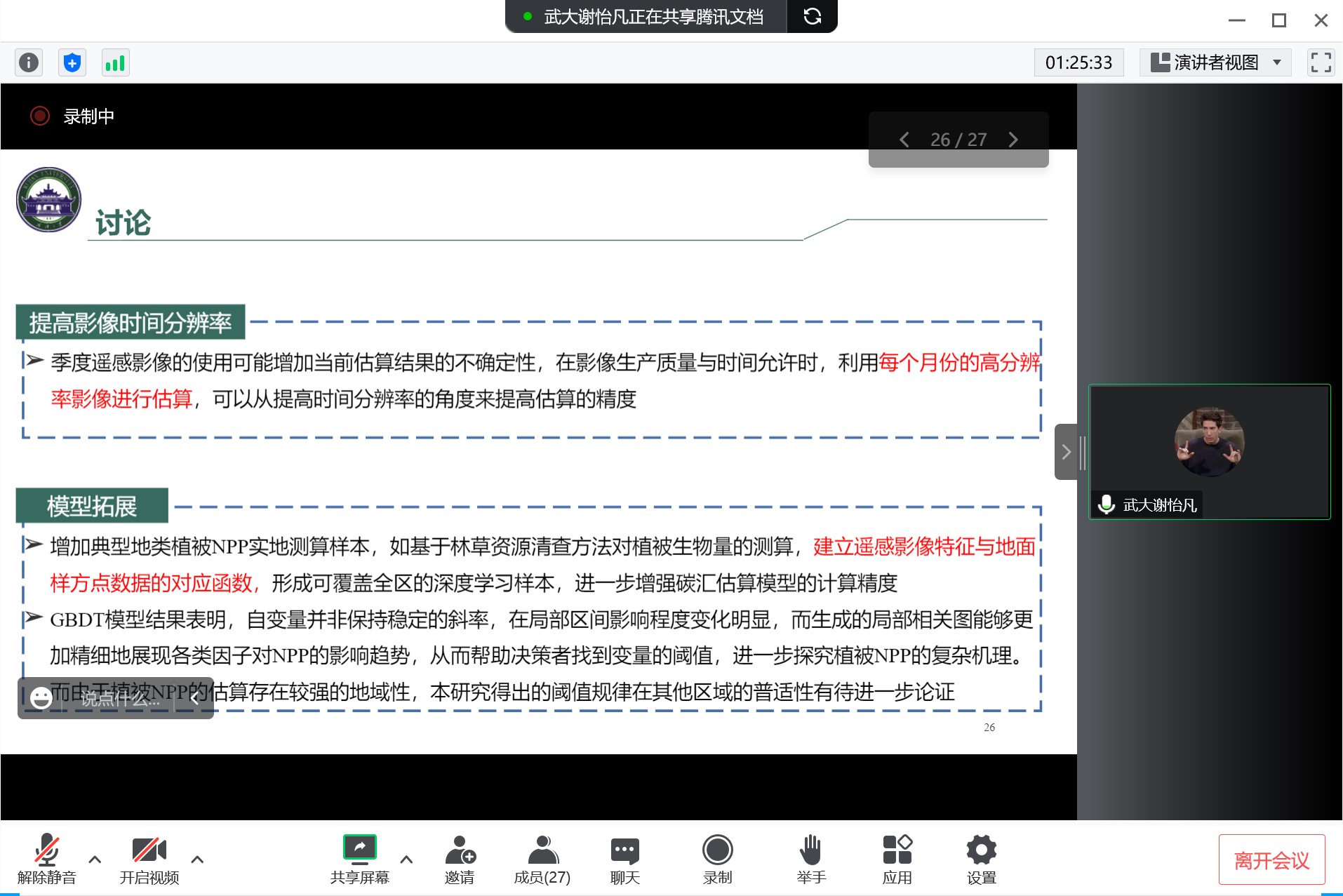 的谢怡凡同学,他以银川市为例,基于高分辨率遥感影像对植被净初级生产力进行估算及影响因素研究,为区域碳监测与管理的评估、动态变化监测以及生态文明建设和双碳战略的实施提供科学依据。