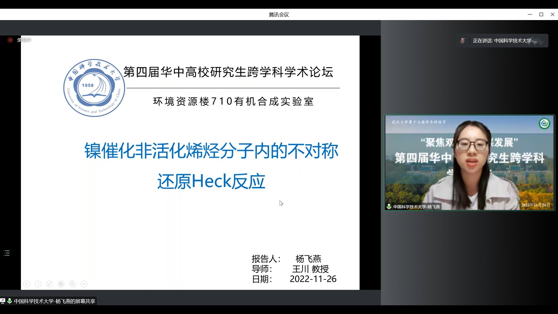 化学与分子科学学院曹余良教授作为点评老师。会议伊始,来自中国科学技术大学化学与材料科学学院的杨飞燕同学带来题目为“镍催化非活化烯烃的分子内不对称还原Heck反应”的报告。杨同学使用镍催化实现非活化1,1-二取代烯烃的分子内的不对称还原 Heck 反应,合成了一系列含有季碳手性中心的环状化合物,并在此反应中取得了优异的不对称诱导效果。曹老师肯定了杨同学的研究方向与工作内容,并建议杨同学今后汇报中应更加突出研究的重点、创新性与目的性。