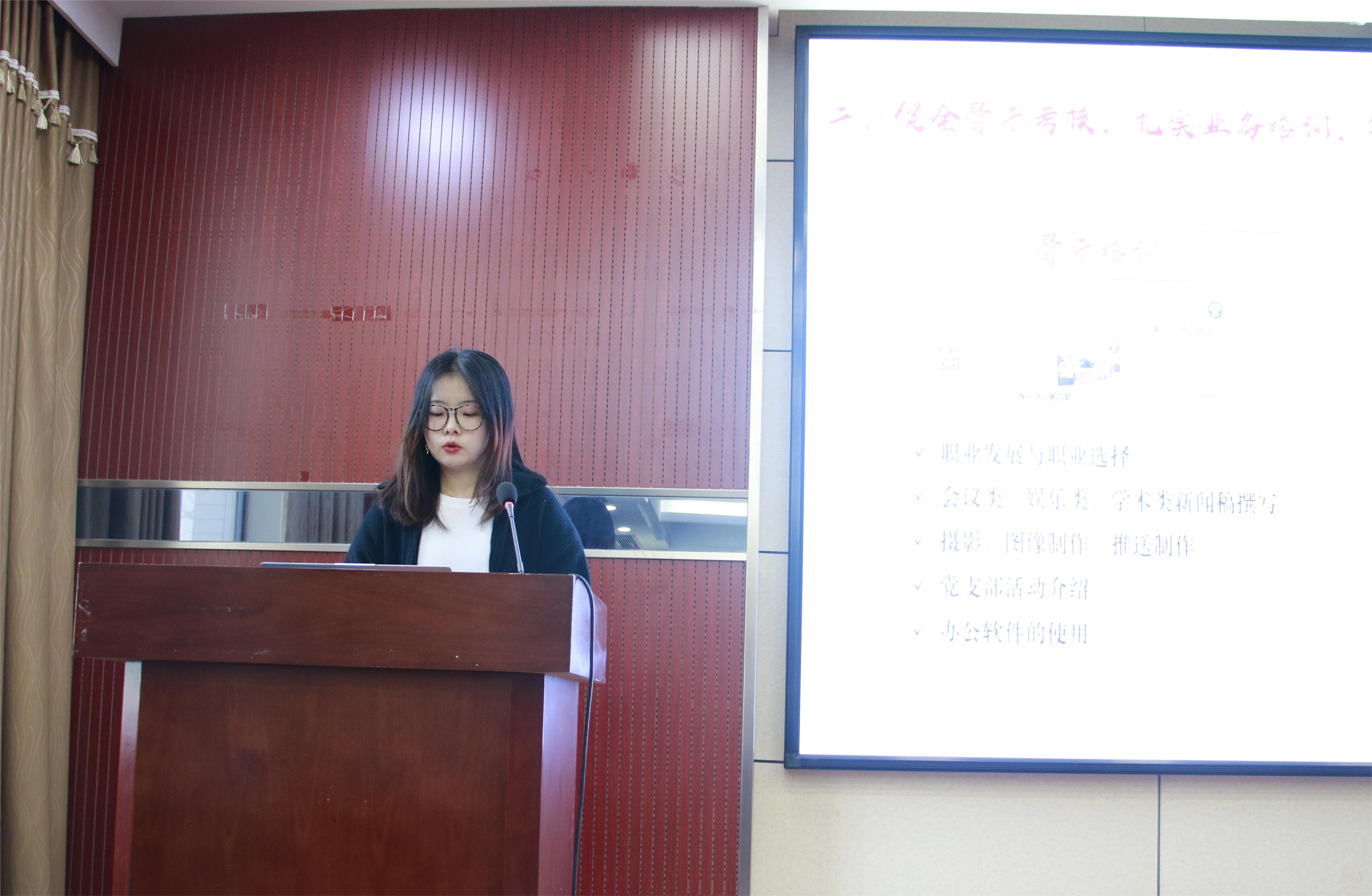 会议第二部分,由研会各工作部门负责人进行述职报告。常代办周风银同学、组织部郝梦媛同学、学术部张亦清同学、宣传部林斐菲同学、文体部田禹希同学、心理极益部陈思彤同学以及职业发展部马丽莎同学从部门的职责和性质出发,总结了本部门半年来开展的实际工作,就工作中存在的问题进行了反思,提出具体可行的完善建议,并对接下来各工作部门的具体工作安排进行部署,力求提高部门工作效能。