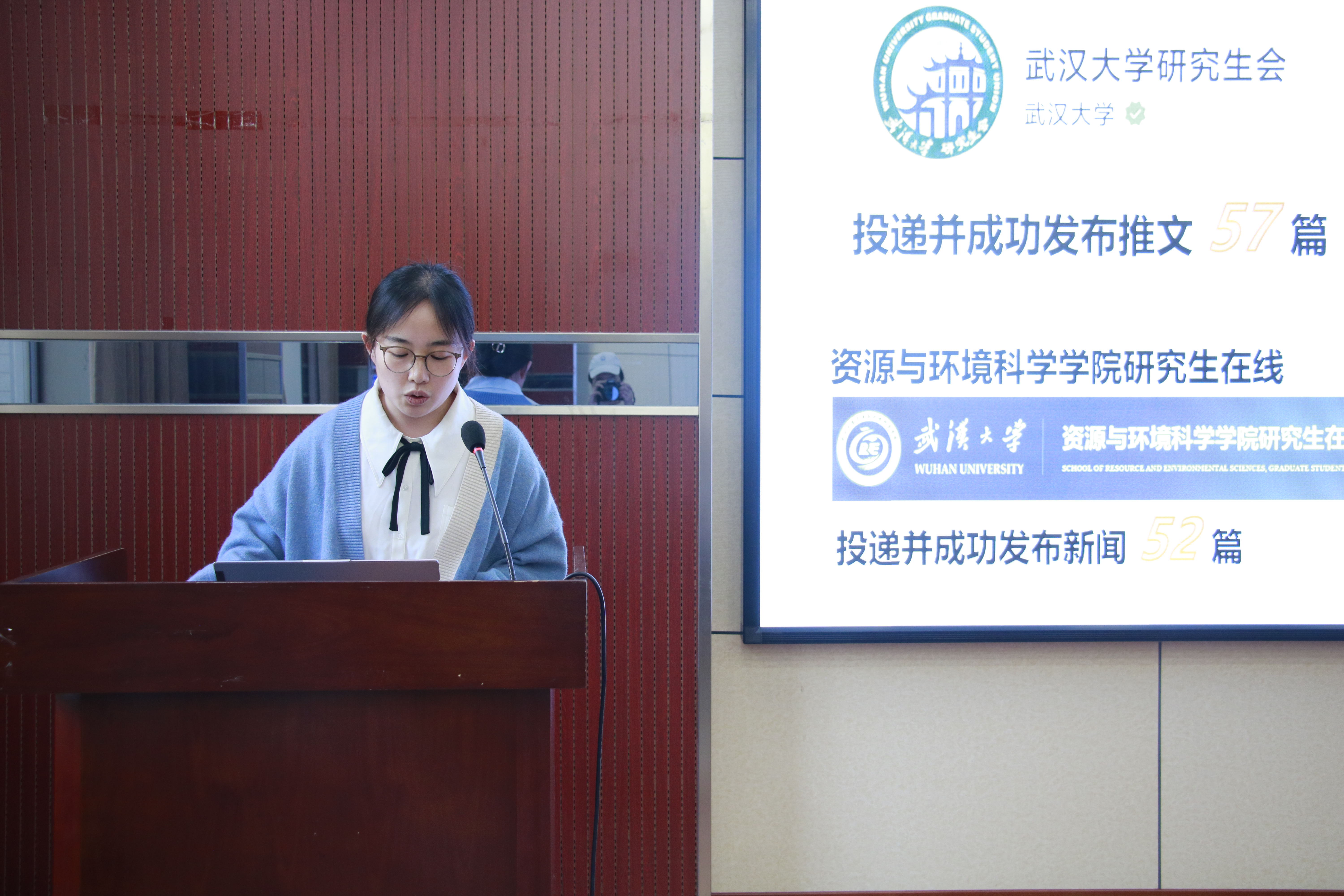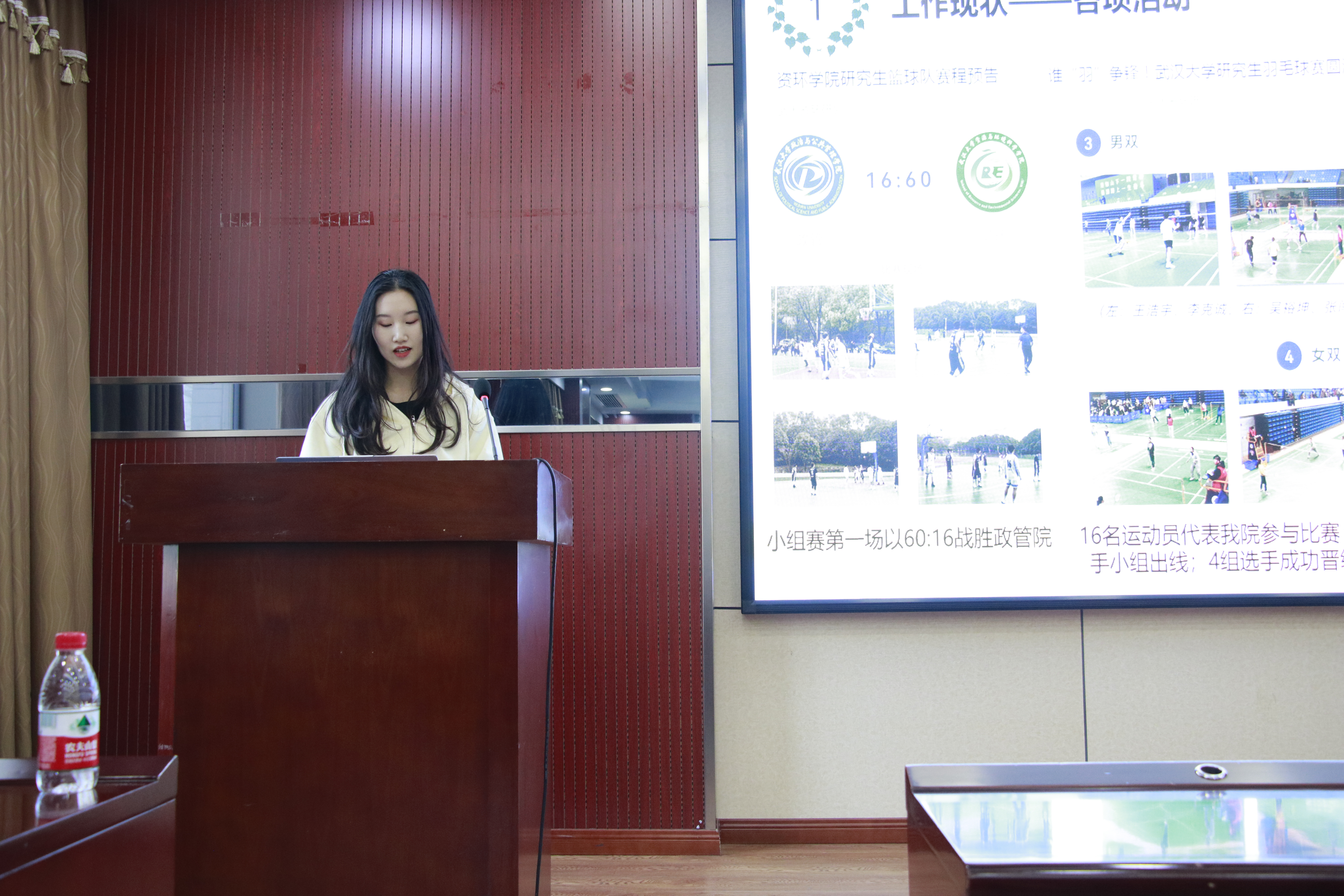 校研究生会常任代表委员王玉同学对日常工作进行了全面的回顾总结,分析了当前存在的问题与不足,并对下半年的工作进行展望,希望更好地服务广大研究生同学。
