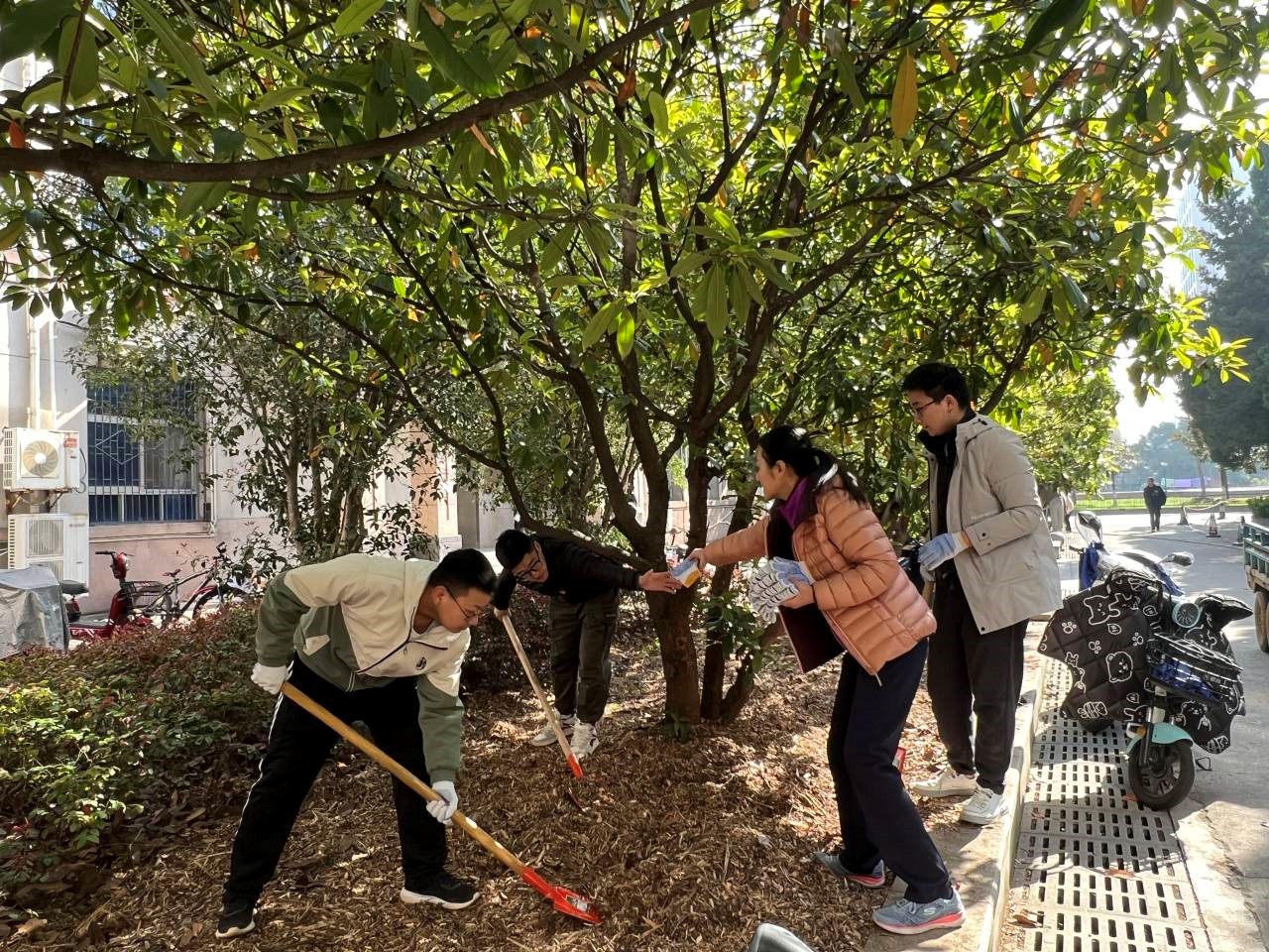 在张主任和朱主任的耐心讲解和亲身示范下,党员同志们逐渐掌握技巧,干劲十足。清理杂物的同学像开启了抓娃娃机模式,每一耙都必定捞起一大堆杂物;修剪枝丫的同学化身植物美容师,为修剪后的植物带去更多的阳光照耀;种草的同学相互之间默契配合,搬运吉祥草、挥锹挖坑、填土栽种,一气呵成。活动有条不紊地进行着,现场一片热火朝天的劳动场景。