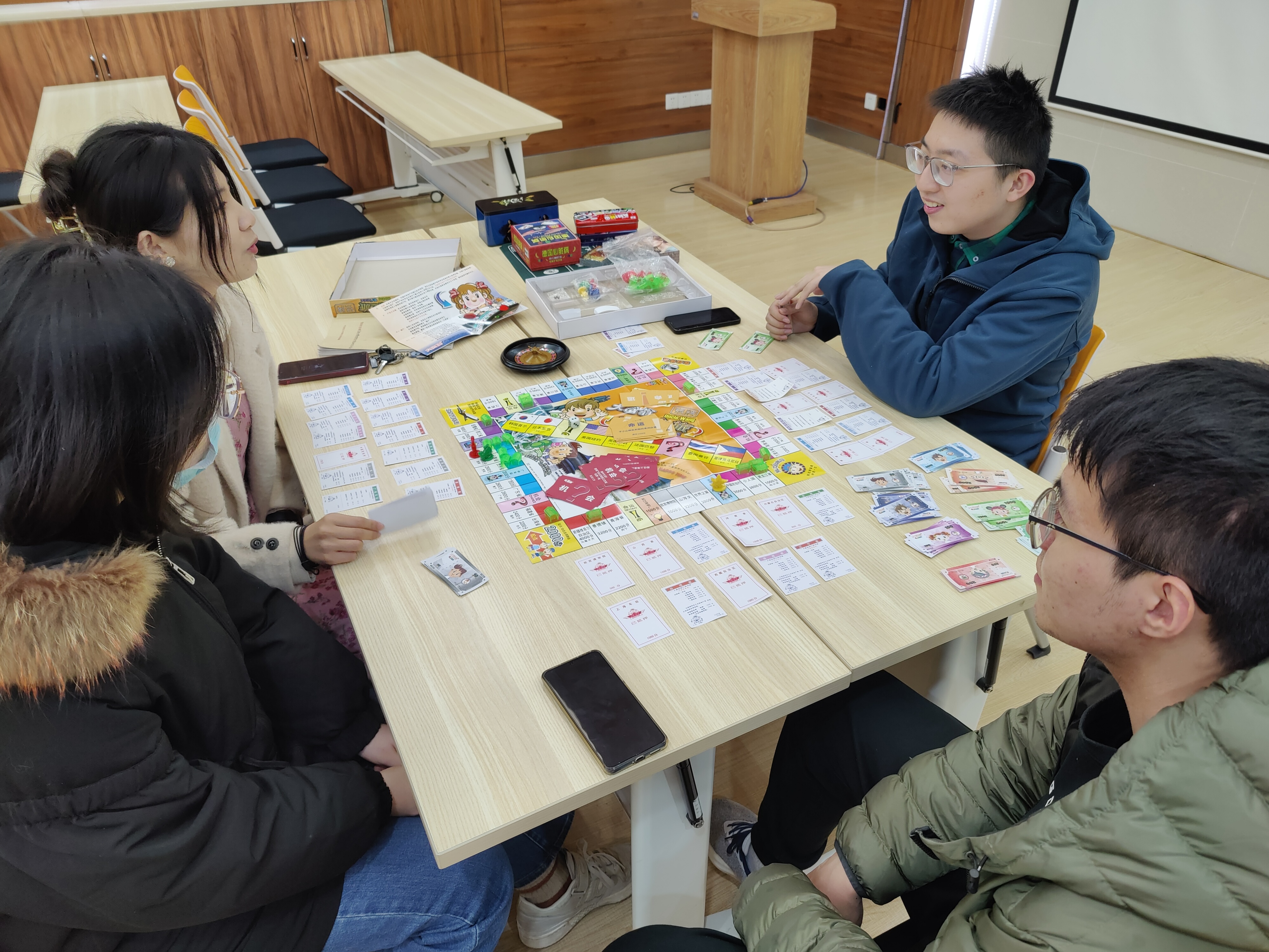 桌上游戏发源于德国,在欧美地区已经风行了几十年。桌上游戏内容涉及战争、贸易、文化、艺术、城市建设、历史等多个方面,大多使用纸质材料加上精美的模型辅助。作为一种面对面的游戏,其非常强调交流。游戏的过程多是注重思考如何利用有限的资源达成既定目标,直接地锻炼了参与者多方面的思考能力,而且以游戏的方式表达,过程生动有趣,能锻炼思考能力的同时又不失吸引力。本次活动广泛征集了同学的建议,通过问卷的方式调查同学们的喜好,并根据统计数据挑选桌游供同学们选择游玩。统计后初步为同学们提供了三国杀,大富翁,狼人杀,阿瓦隆,UNO和德国心脏病共六种桌游。