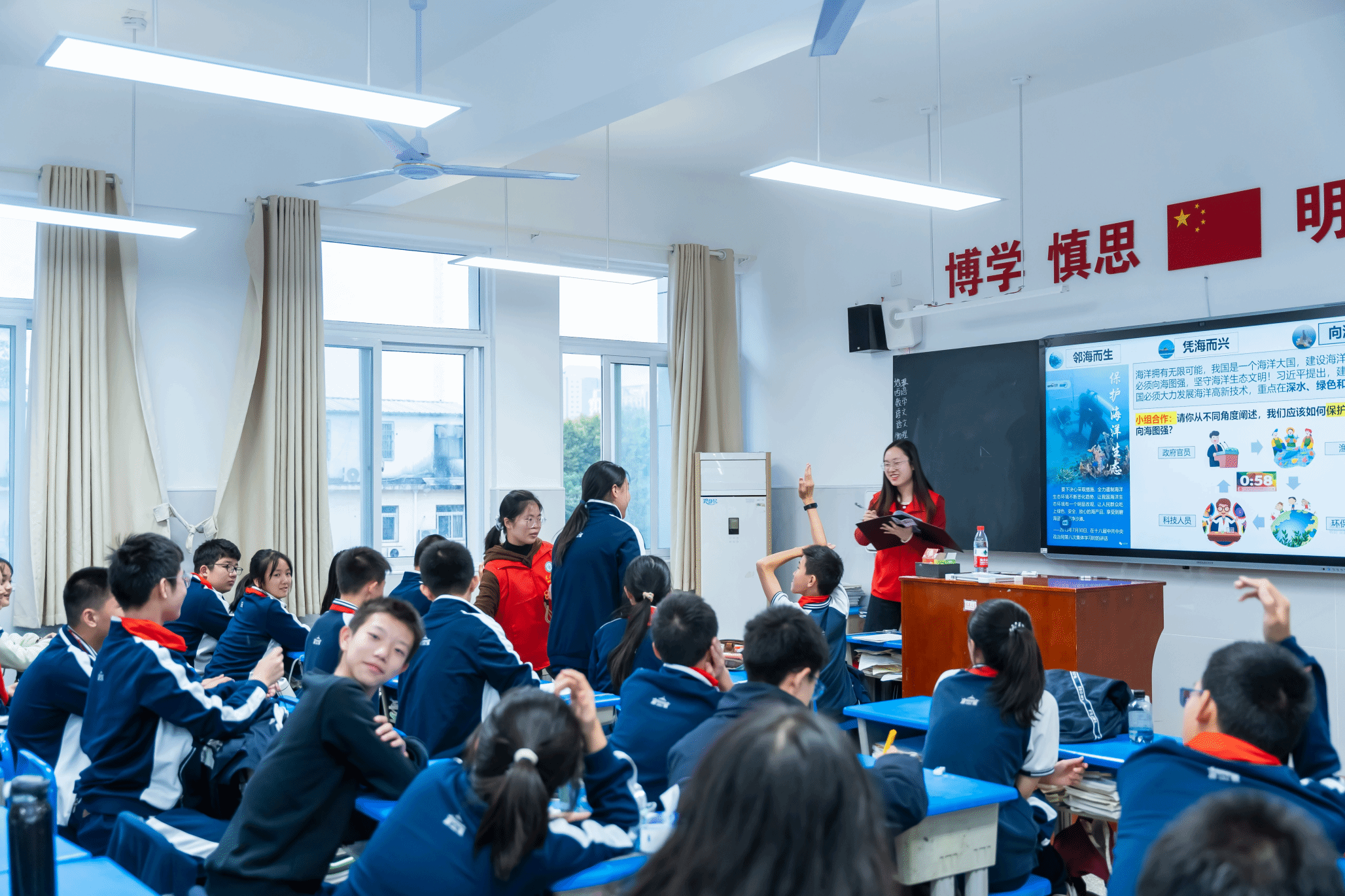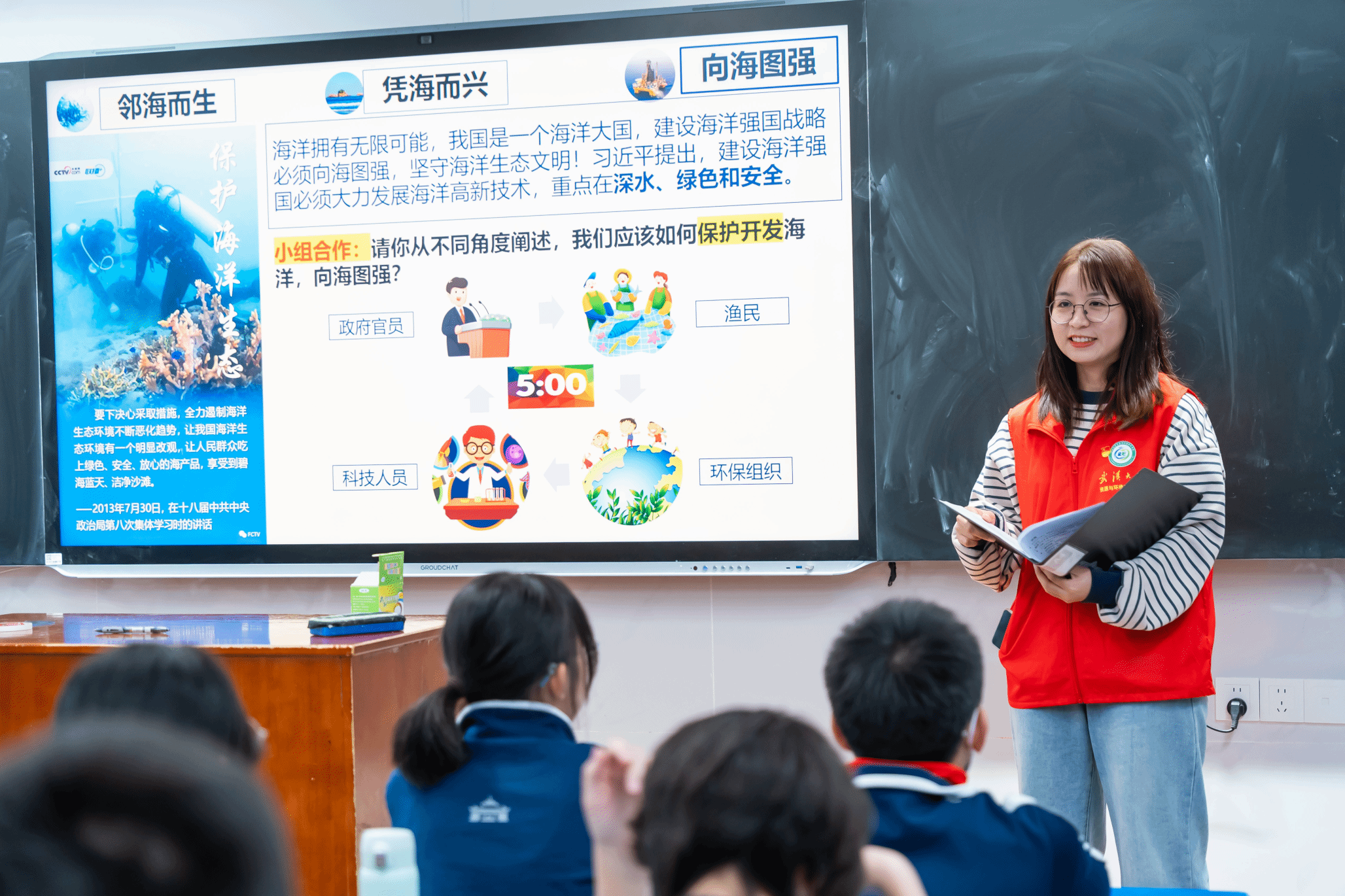 随后的小组分享环节更是将课堂气氛推向了高潮。同学们分别从政府官员、渔民、科研人员、环保组织等角色出发,提出保护和开发海洋的策略。同学们积极地与“小老师”们互动,分享自己的见解,展现了他们对建设海洋强国的爱国热情。