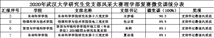 2020年5月25日澳门美高梅 举办澳门美高梅 党支部风采大赛理学部复赛线上比赛,根据《澳门美高梅 研究生党支部风采大赛理学部复赛方案》,确定了党支部获奖排名和支部书记最佳风采奖个人奖名单,现予以公示,公示期为2020年5月26日至5月30日。公示期间,如对获奖名单有异议,请于2020年5月30日17:00前,将意见发至梅老师邮箱[email protected]。