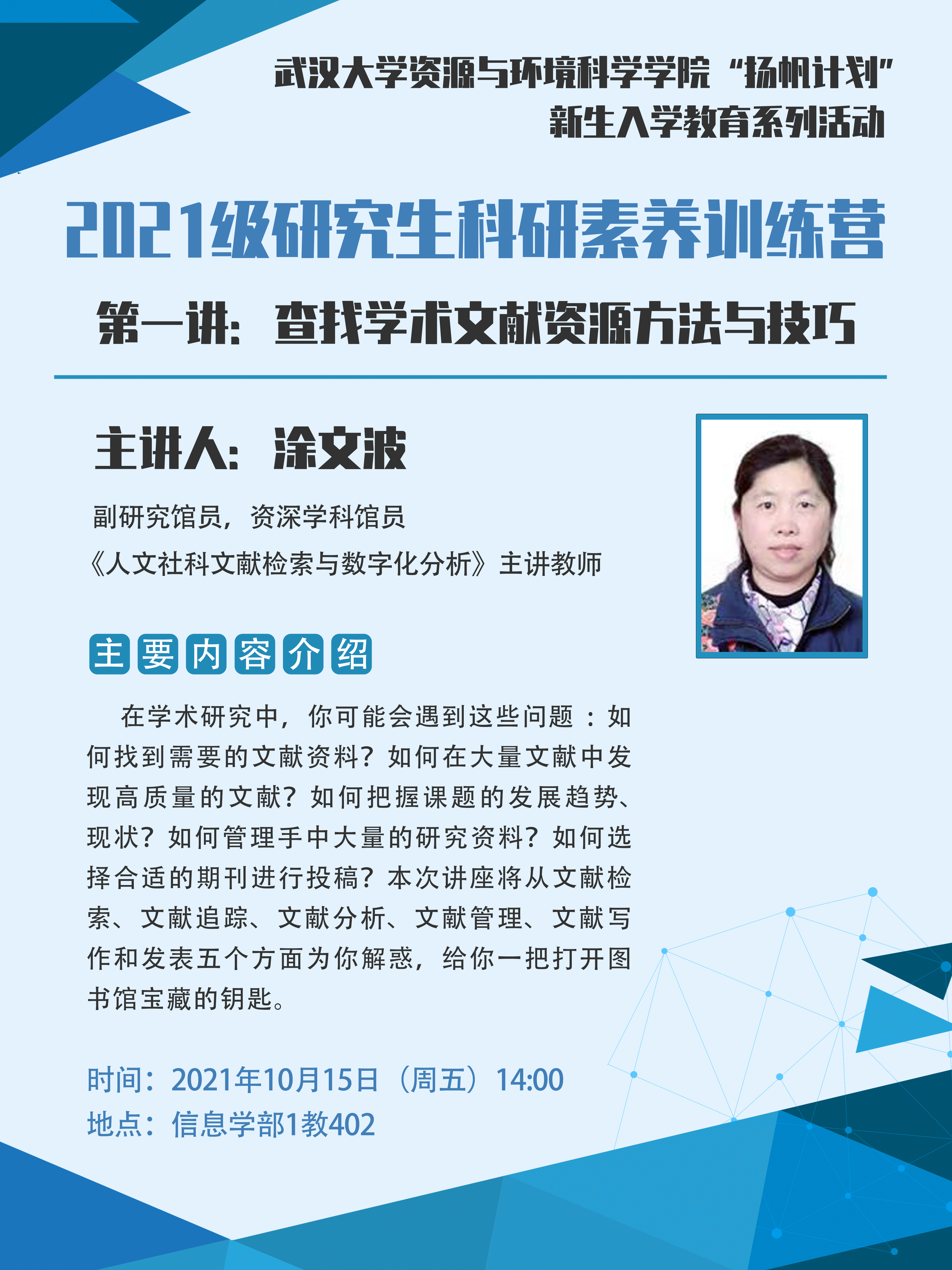 研究生熟悉科学研究过程、掌握运用科研工具能力,进行教育高质量发展,特举办“扬帆计划”2021级研究生科研素养训练营。