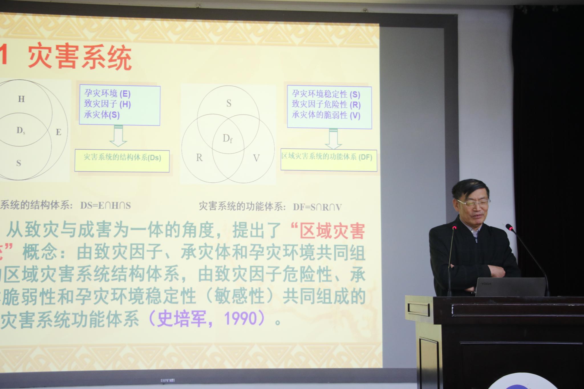 接着,史培军院士从灾害系统、灾害形成过程、灾害系统的复杂性、全球气候变化风险、巨灾系统、灾害风险区划、综合风险防范模式七个方面对综合自然灾害抗御的理论进行了详细讲解。史院士认为从地理学的视角出发,灾害形成的非动力学过程使其具备不可预报性,将非系统动力学因素定量化研究,提高设防、评估损失、预报风险,才是应对灾害的方法。