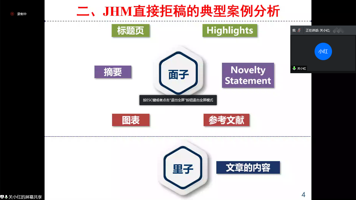 简要阐述论文发表的重要性后,关小红教授从期刊编委的角度指出:论文是否被拒稿的决定因素包含两个部分——“面子”和“里子”。前者包括标题页、摘要、图表、Highlights(研究亮点)、Novelty Statement(创新性声明)、参考文献等细节。规范的“面子”反映着精准的实验设计、操作、结果及严谨的科研逻辑和内容结构。而“里子”则指文章的内容。