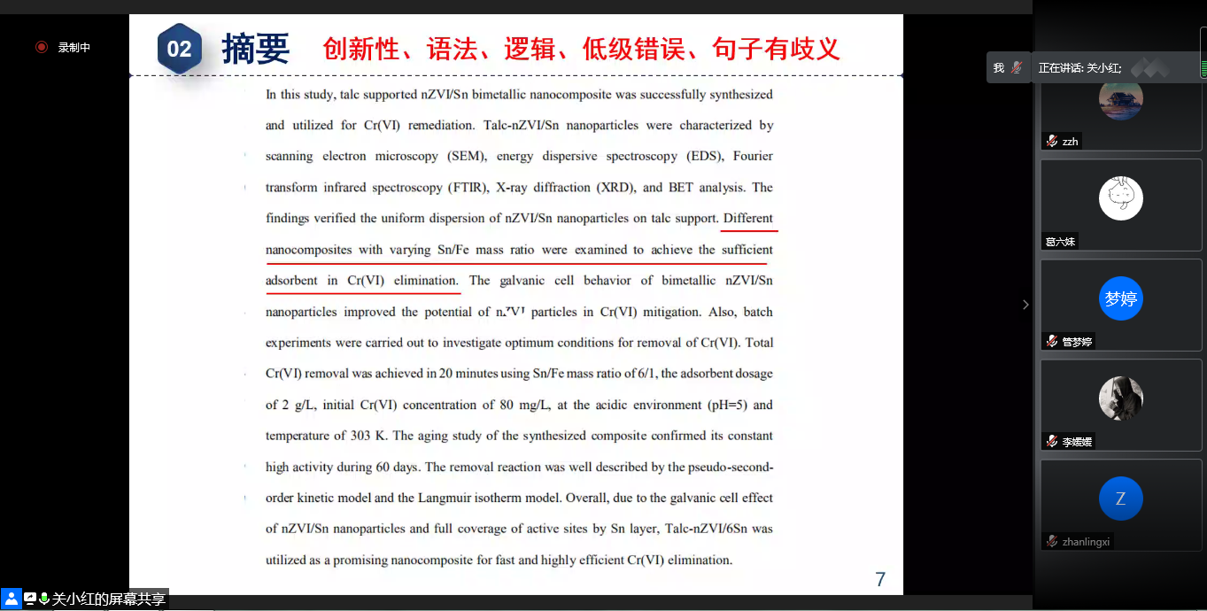 11月25日下午,国家杰出青年科学基金获得者、同济大学市政工程系关小红教授通过线上会议的方式带来了一场主题为“规范的科研表达——那些会让你忽视的细节”的学术报告。报告从论文发表的重要性、《Journal of Hazardous Materials》直接拒稿的典型案例分析和个人经验三个方面,对环境领域SCI论文写作的规范表达及其细节进行了交流探讨。