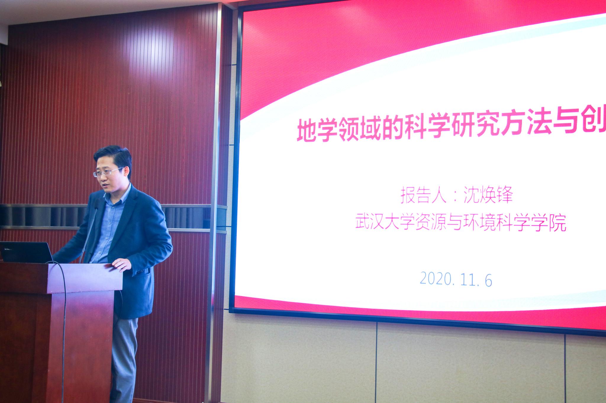 第四讲是由沈焕锋副院长讲授的题为“地学领域的科学研究方法与创新思维”的讲座。沈教授为同学们介绍了国际知名学者吉姆格雷的科研四范式以及国内知名学者宋长青提出的地理学新四范式,沈教授认为在现今大数据时代,实证范式与大数据范式的结合十分重要,大数据存在假象,需要数据驱动与实证研究相结合才能更好地发挥大数据的价值。最后沈教授也对同学们提出了要勇闯“文献关”、在学科交叉融合下寻找错位优势、理论研究与应用研究互相促进、提高自主学习意识的期许。讲座为地学领域的同学们探索研究方法、培养创新思维指明了方向。