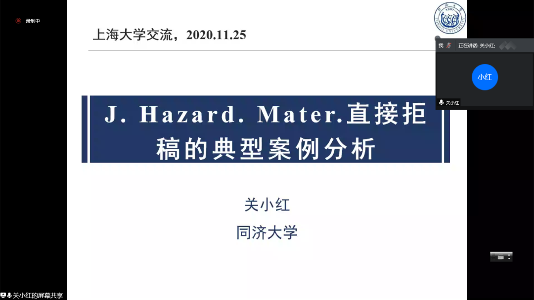 第七讲是由同济大学关小红教授带来的题为“规范的科研表达——那些会让你忽视的细节”的讲座。关教授从论文发表的重要性、《Journal of Hazardous Materials》直接拒稿的典型案例分析和个人经验三个方面,对环境领域SCI论文写作的规范表达及其细节进行了交流探讨。讲座上,关教授为同学们指出了许多需要注意的细节,如有效数字的规范书写、图表的适宜数量、坐标轴范围的合理设置、排版配色的美观等等,为同学们打磨规范的高品质论文做好了良好的铺垫。