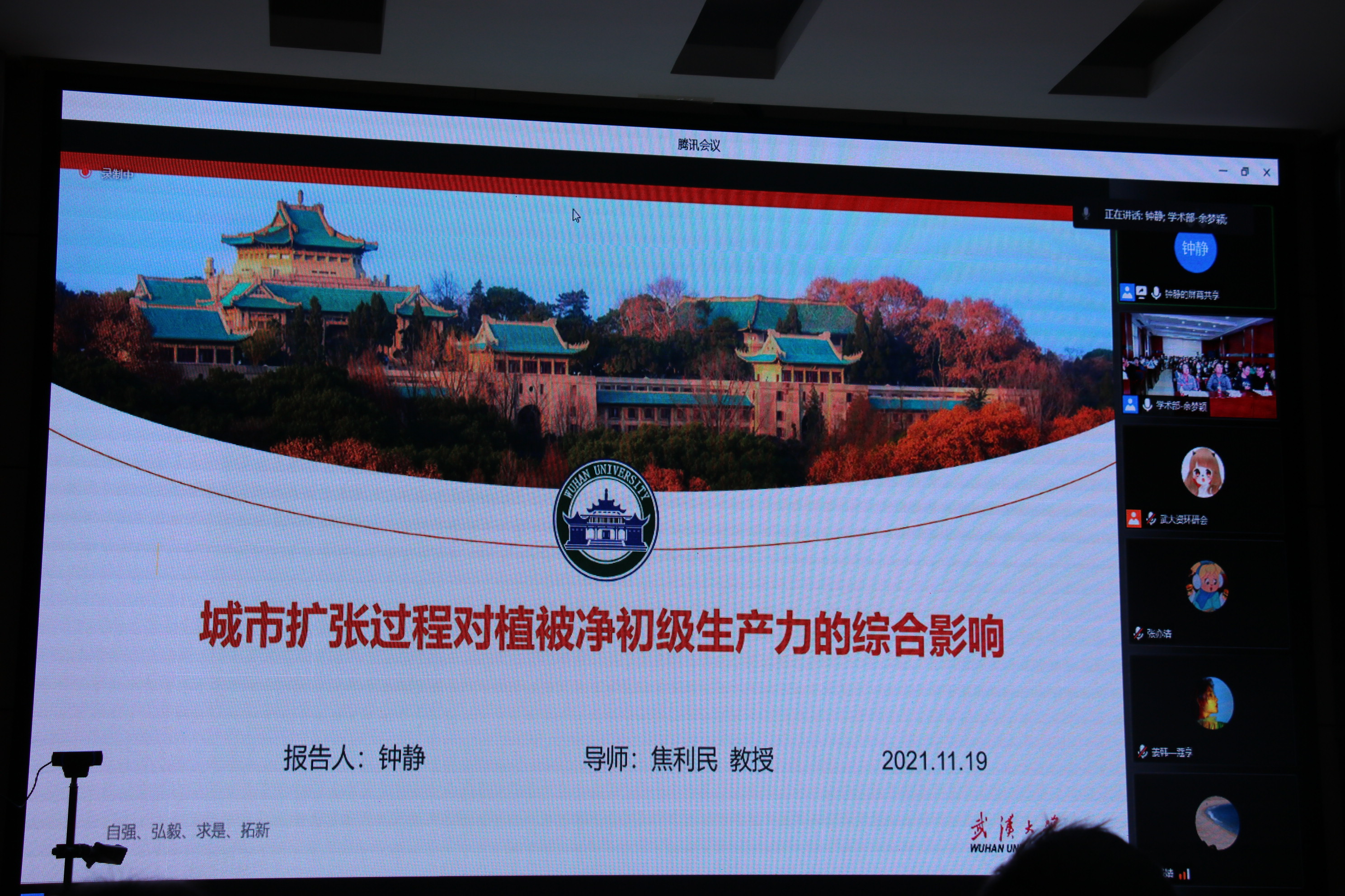 接着,钟静博士为大家带来了关于“城市化过程对植被净初级生产力的综合影响评估”的报告。城市扩张的过程包括生产性土地向非生产性不透水地表转变造成的直接影响和城市化效应对植物生长的间接影响。钟静博士的研究定量分析了不同城市扩张过程和模式下植被的综合变化过程,解释了城市扩张过程对城市植被的动态影响,并为预测未来城市发展的生态后果以及当地的生态决策提供了支持。几位老师就钟静博士的研究区域选择以及最终成果的应用提出了一些相关建议。