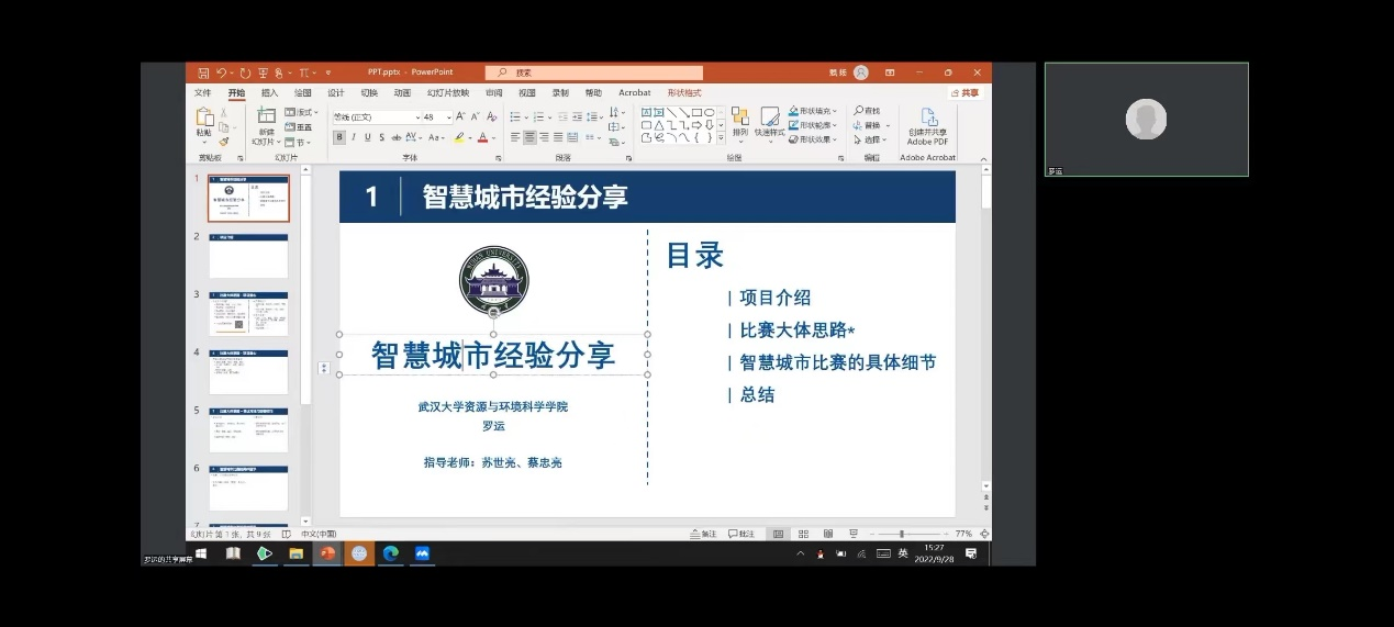 作为该赛事校内秘书处单位,于2022年9月28日 15:00,举办了智慧城市技术与创意设计大赛线上分享会。有意参加第八届大赛的各学院同学参与了此次会议。会议由资环院研究生科技创新实践协会副会长李莹主持。