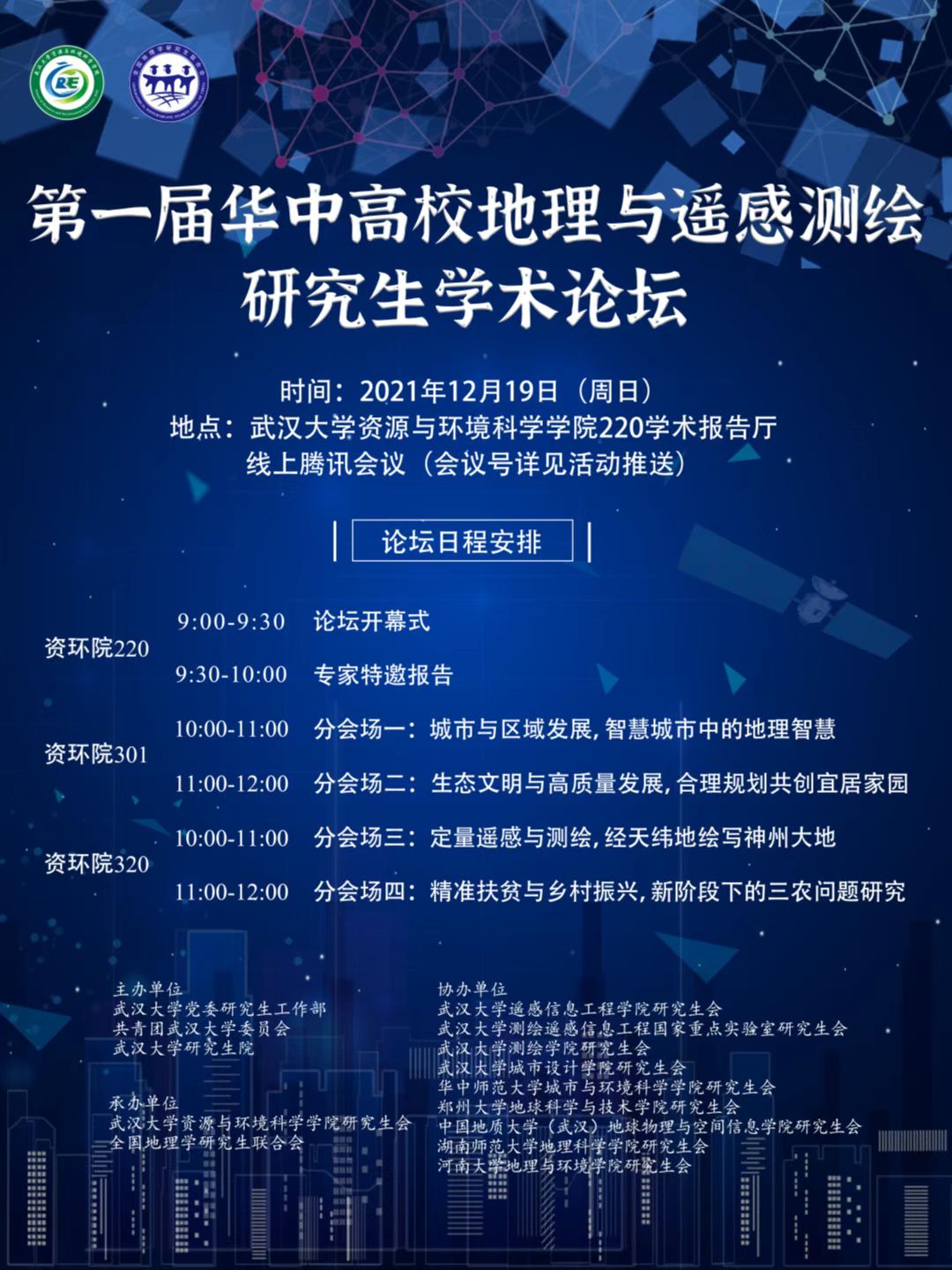 遥感信息工程学院研究生会、测绘学院研究生会、测绘遥感信息工程国家重点实验室研究生会、城市设计学院研究生会、卫星导航定位技术研究中心研究生会