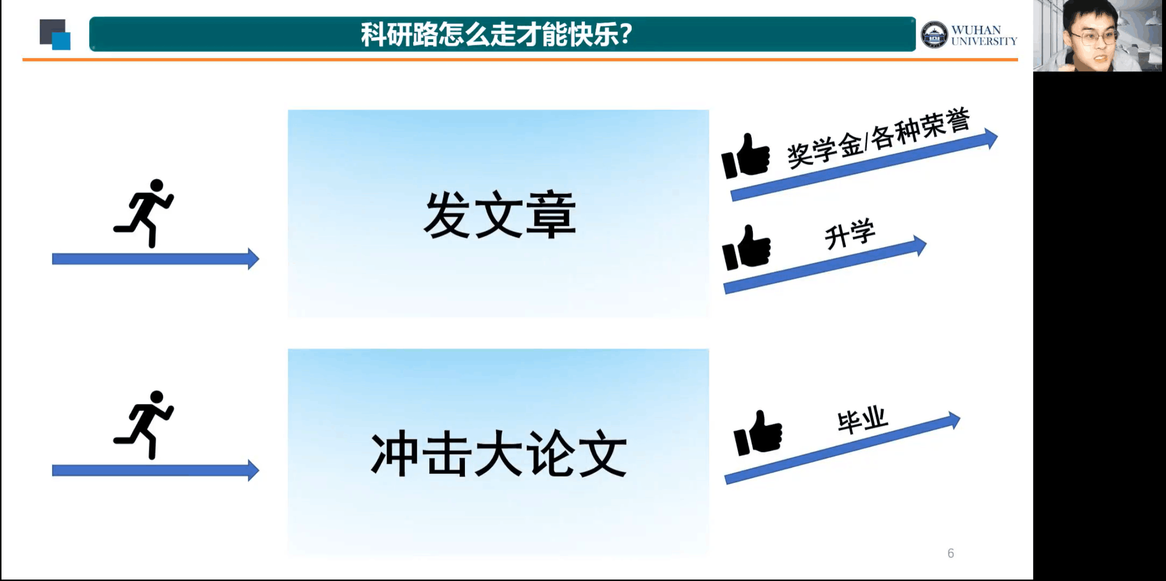李鹏博士从四个方面进行了经验分享,首先是关于“科研之路如何走才快乐”,他根据自己的科研经历总结出,关键在于明确自己的目标。如果自己选择的科研课题相对容易产生成果,则要尽快动手实践并着手准备文章;如果自己选择的科研课题有一定困难,可以在实践的过程中整理出科研的框架,并且多同老师和师兄师姐沟通,寻找突破点。