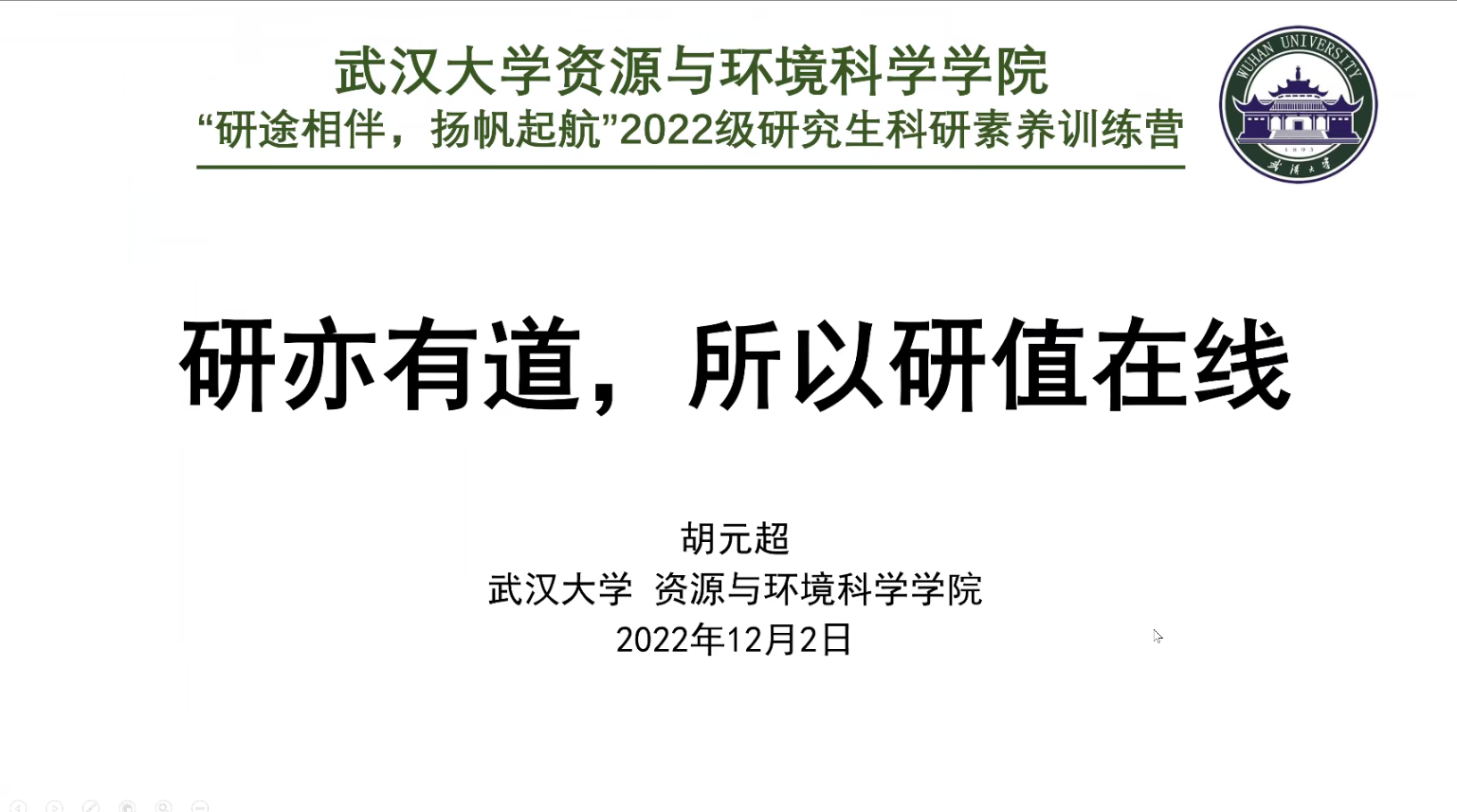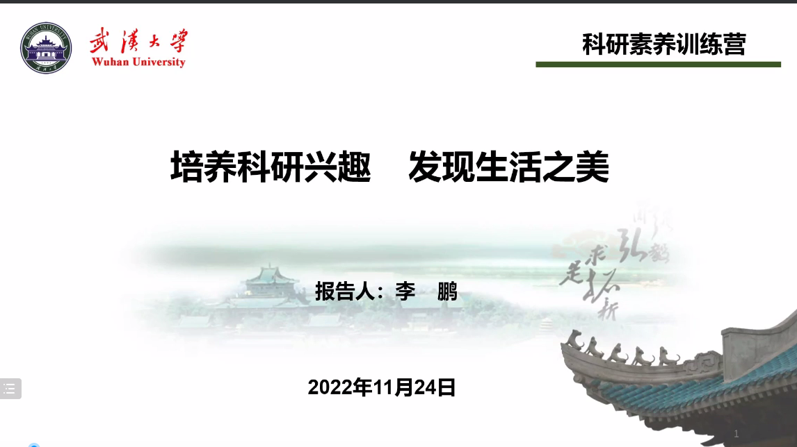 为深入贯彻落实习近平总书记在全国研究生教育大会上的重要讲话精神,切实增强育人本领,着力发挥科研育人功能,培养具有研究和创新能力的高层次人才,引导刚开始接触科学研究生涯的新生们树立正确的学术导向、熟悉科学研究过程、掌握运用科研工具能力,进行教育高质量发展,特举办“研途相伴,扬帆起航”2022级研究生科研素养训练营系列讲座活动。因疫情防控要求,本届科研素养训练营以线上线下相结合的形式开展,共举行了八场专题讲座,邀请了诸多具有代表性的学术大咖与优秀学子为同学们传道授业解惑。