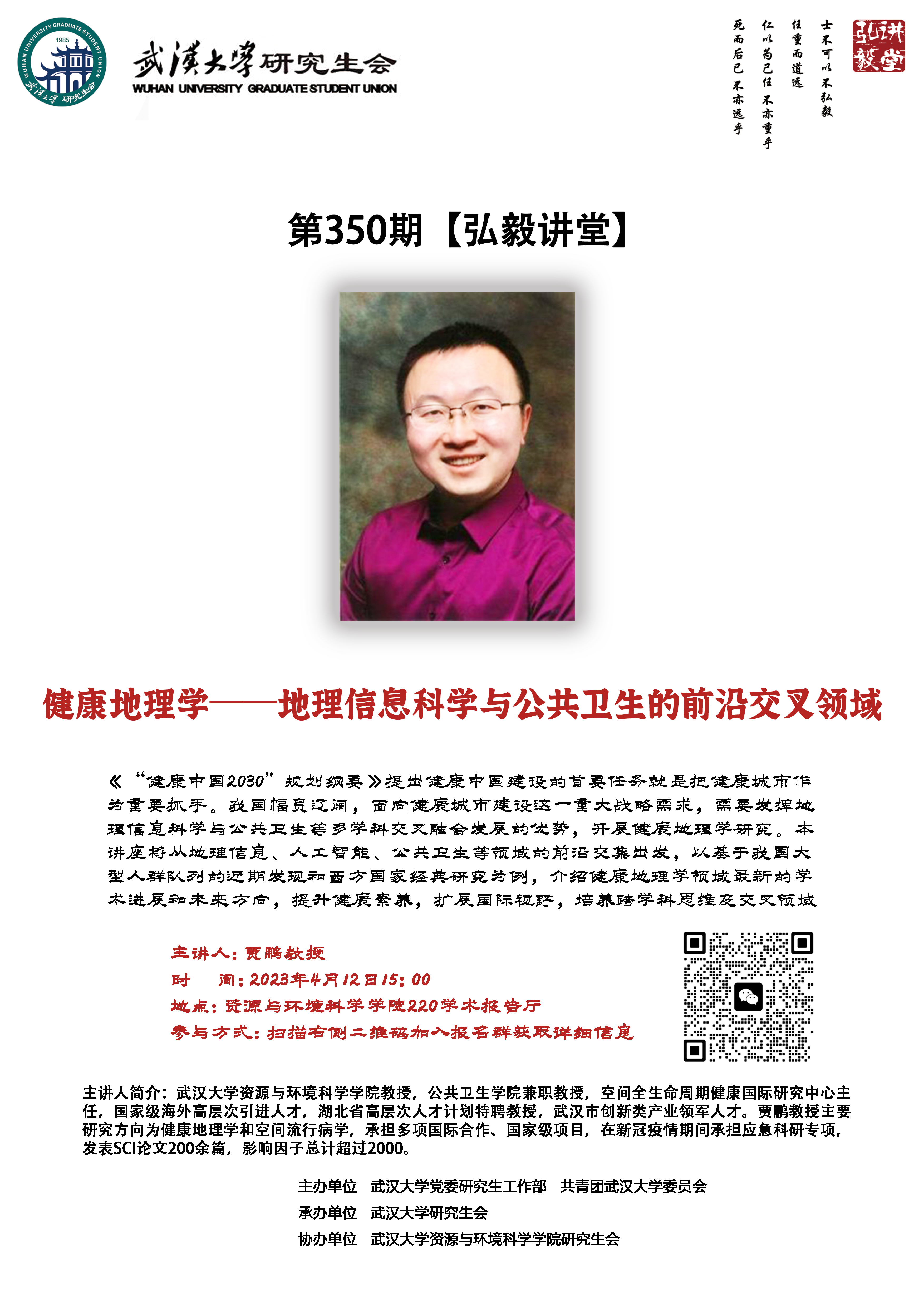 贾鹏教授,带领同学们深入了解健康地理学领域最新的学术进展和未来方向,欢迎广大同学踊跃参与!