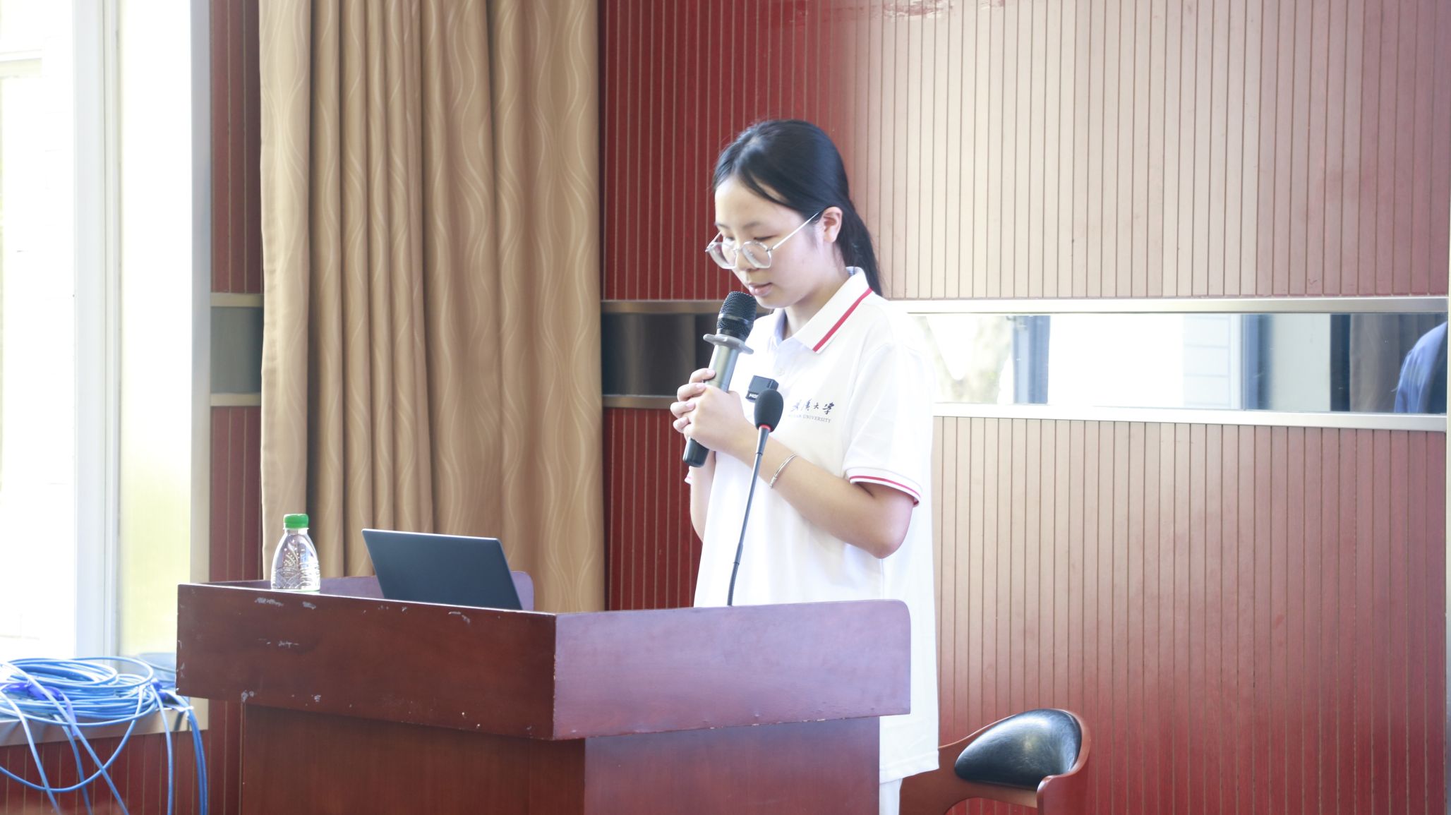 教授蔡忠亮老师致辞。蔡教授首先介绍了李不白先生,并对其作品表达了高度赞扬。蔡教授指出,李先生巧妙地将历史与地理相结合,开创出一种独具魅力的文学表达方式。这种新颖的视角,不仅可以启发现场的同学们,让他们深刻认识到知识的跨界融合之美,也让他们看到理工科专业同样可以在文学创作的广阔天地中大放异彩。