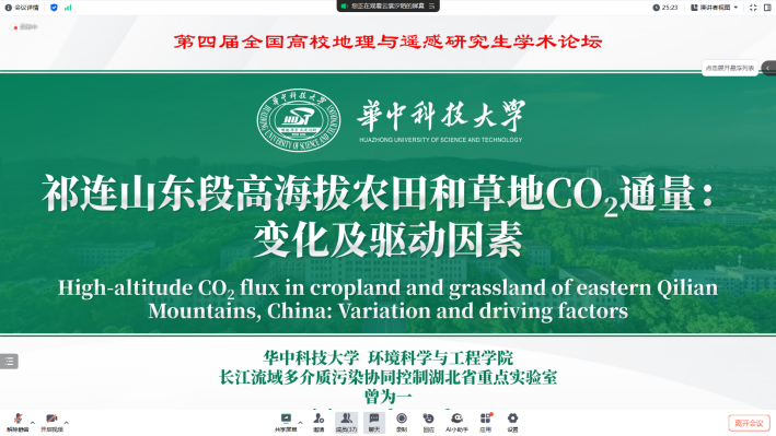 第二位汇报嘉宾是华中科技大学环境科学与工程学院2022级硕士曾为一,他的汇报题目是“High-altitude CO2, flux in cropland and grassland of eastern QilianMountains, China: Variation and driving factors”。在汇报中,他通过系统评估祁连山东部农田和草地生态系统中土壤碳通量的空间模式及其影响因素,探讨海拔高度和土壤养分对碳通量的影响,分析了2000至 2020年间净初级生产力(NPP)和碳储量的动态变化。结果表明,深层土壤CO2通量显著增加,土壤有机碳(SOC)、总氮(TN)和总磷(TP)与碳通量相关。研究还发现气候和人类活动对NPP有正面影响,土地利用变化导致碳储量总体减少。本研究为高海拔地区的碳循环和生态保护提供了科学依据。