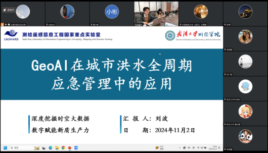 测绘学院2023级的硕士研究生刘波作主题为“GeoAI在城市洪水全周期应急管理中的应用”的报告。刘波结合多项研究成果,涵盖洪水的灾前预防、实时监测与损失评估的全周期管理开展了本次报告。研究将遥感、地理信息与深度学习/机器学习相结合,提高了洪水应急管理效率,从大数据角度探索出了城市洪水治理新思路。在点评环节,管小彬老师对刘波的研究给予了肯定,管老师认为刘波的研究工作非常全面,涉及到城市洪水在前、中、后三个阶段的时空大数据应用,内容丰富。