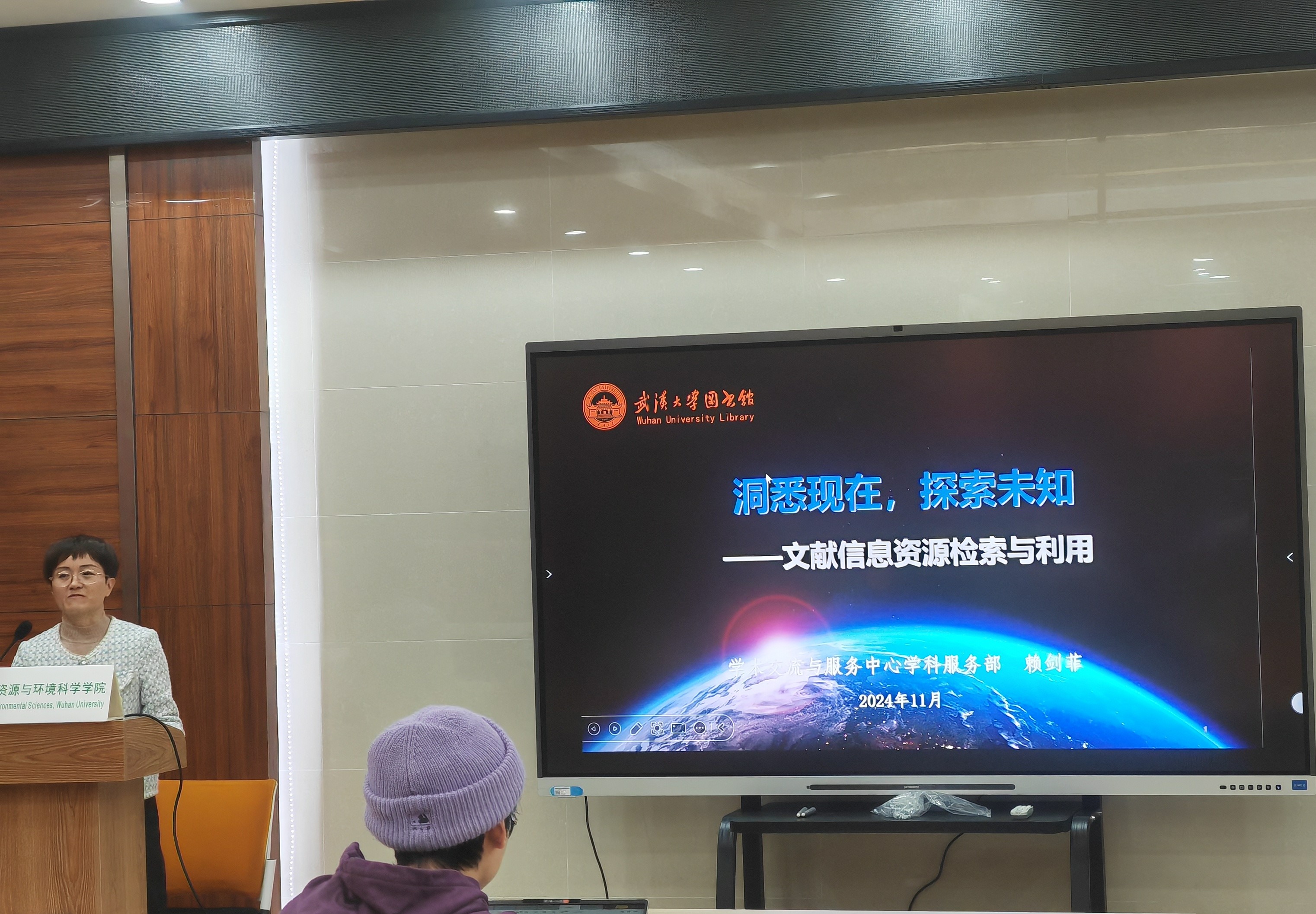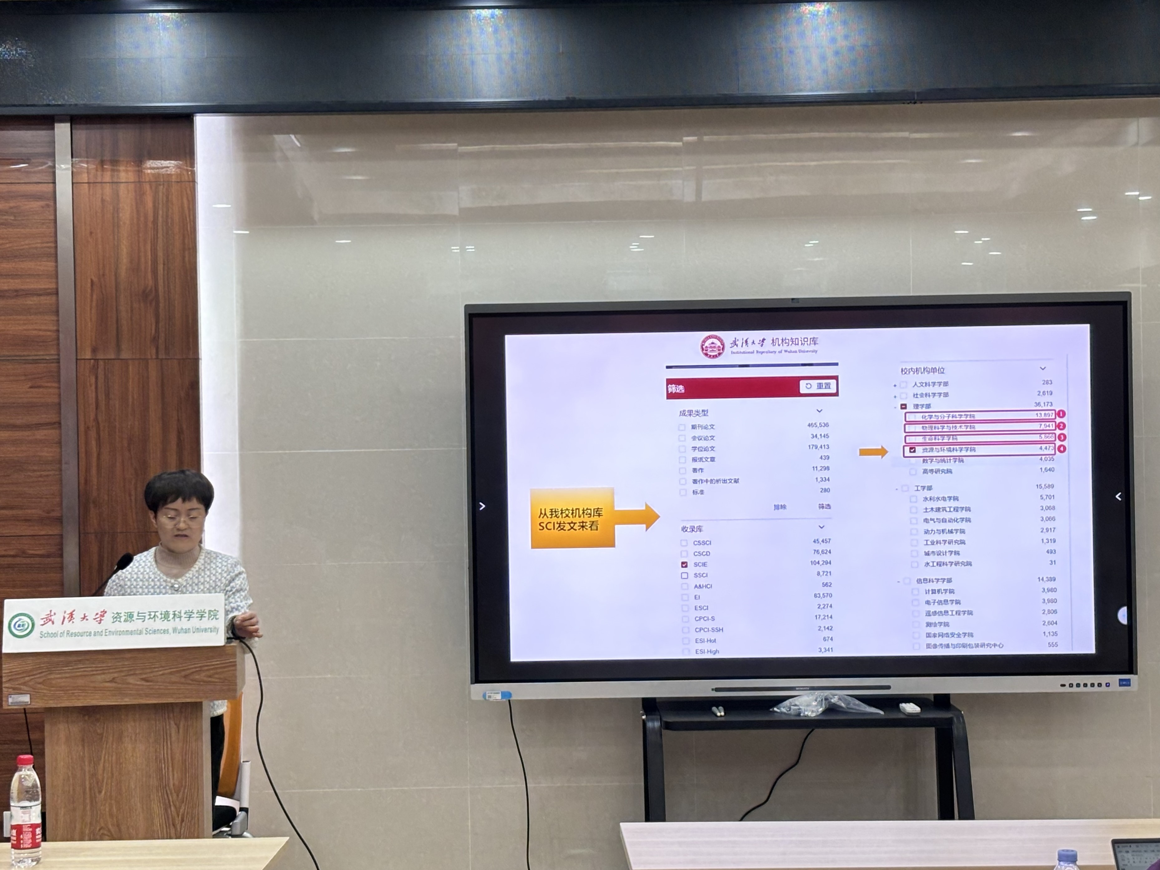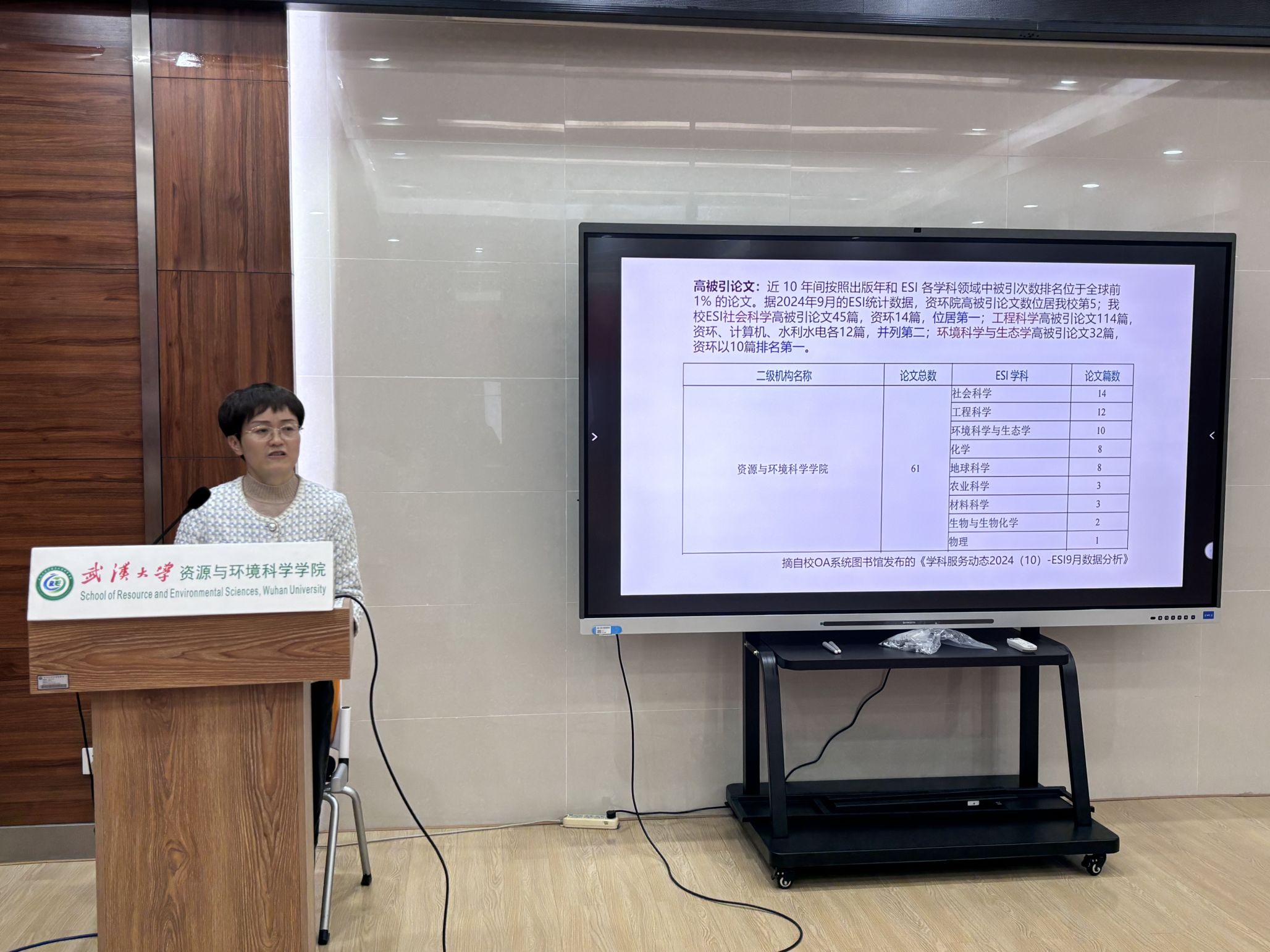 的文献资源建设情况。我校拥有丰富的文献资源,印刷型文献订购量达 732 万册,电子型文献更是达到了 1550 万册,电子资源占比逐年上升。接着,赖老师为同学们介绍了常用的数据库,包括中文数据库中的知网、万方、维普等,以及外文数据库中的 Web of Science、Scopus 等。值得一提的是,资环学院的SCI 论文数量和引用数量均位于全校前列。据 2024 年 9 月的 ESI 统计数据,资环院高被引论文数位居我校第 5;我校 ESI 社会科学高被引论文 45 篇,资环 14 篇,位居第一;工程科学高被引论文 114 篇,资环、计算机、水利水电各 12 篇,并列第二;环境科学与生态学高被引论文 32 篇,资环以 10 篇排名第一。这些数据充分展示了资环学院在学术研究方面的卓越成就,也为同学们树立了榜样。