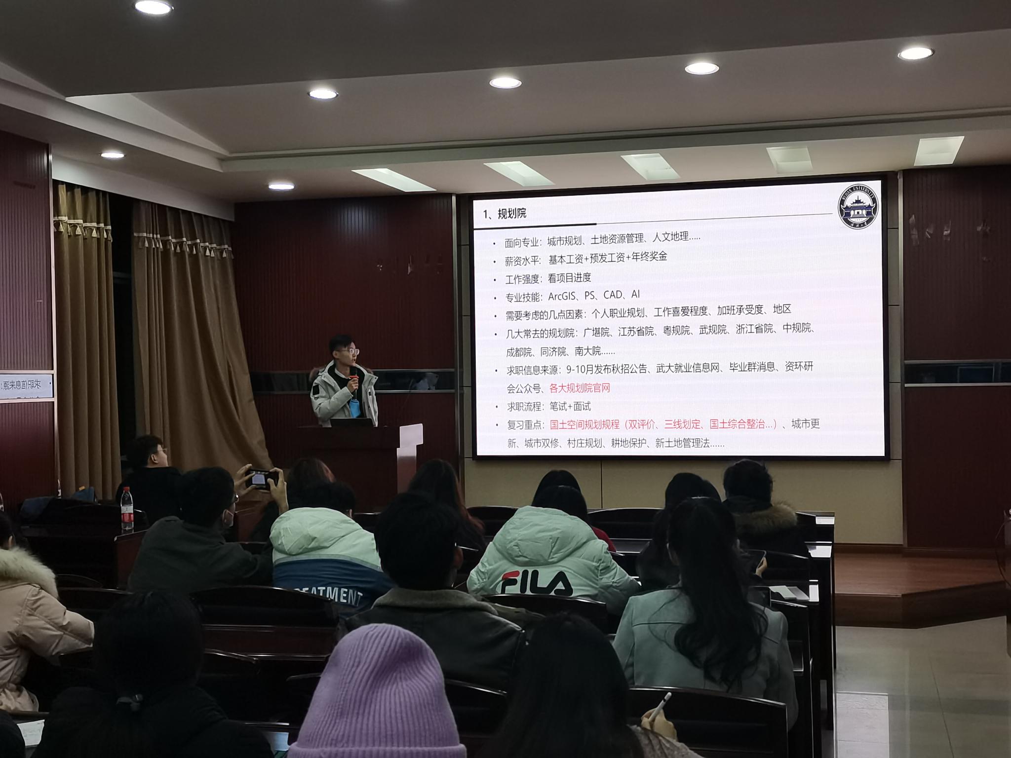 赵晓东通过求职中的关键要素,向同学们分享了地域、薪资、单位类型、加班强度等因素对于职业选择的影响。同时师兄也向同学们分享了秋招季中打好求职信息战的方法。在提问环节,师兄向同学们介绍了武汉市内较为大型的国企事业单位的招聘情况及其薪资待遇水平。