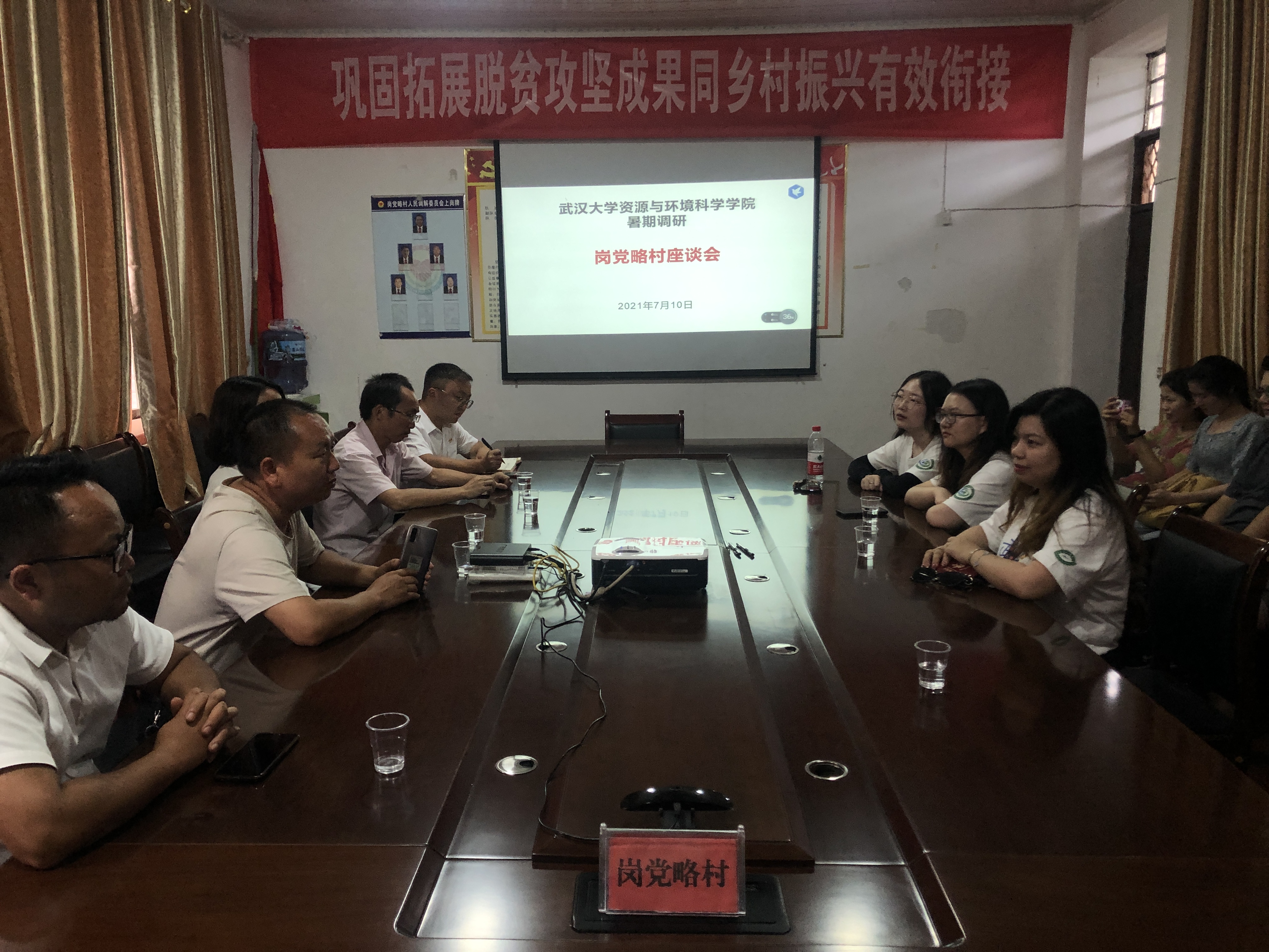 2021年7月10日岗党略村党总支书记刘忠海、小河村党总支书记杨宏权带领实践队员进行当地考察,简单介绍了村庄的主要产业以及脱贫攻坚战的胜利成果。随后分别进行了岗党略村、小河村座谈会,刘忠海书记就舒俊蛟同志基层工作进行总结和肯定,同时就选调生的角色转换以及如何面对工作挑战等方面展开深入交流。座谈会气氛融洽,实践队员们认真倾听,积极提问。