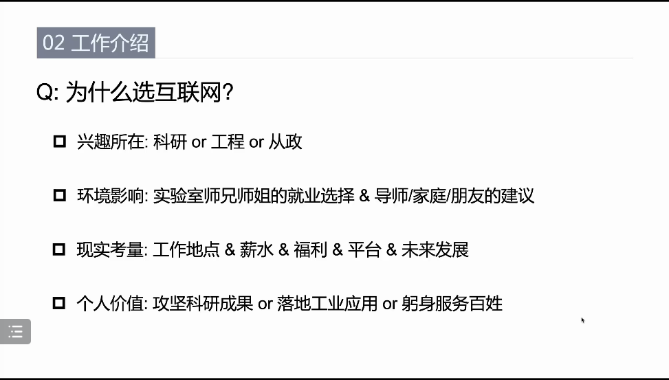 作为本次分享会唯一一位就职于互联网企业的嘉宾,胡振宇师兄为同学们详尽地介绍了自己在微信小程序中心的工作情况和工作成果,并从兴趣、环境影响及个人价值等方面,阐述了选择互联网行业的理由,同时,他还详细介绍了前端开发岗目前的工作内容以及业务范畴,以及在互联网企业的工作日常。疫情期间,用自己的专业技能为商家解决问题,使他获得了成就感;求职和工作时保持独立思考的习惯,培养沟通、学习和抗压能力,师兄的建议使同学们获益匪浅。