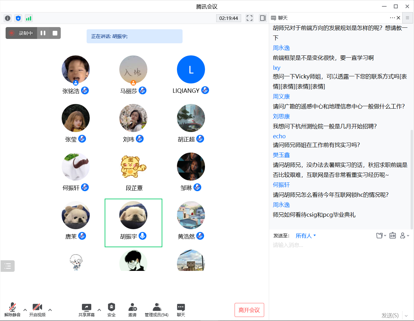 分享环节结束,互动问答环节同样精彩。百余人参与的线上会议,聊天窗口有条不紊,气氛火热,同学们的问题丰富多样,师兄师姐们的回答具体详实,分享会就在这样轻松愉悦的氛围中,圆满结束了。