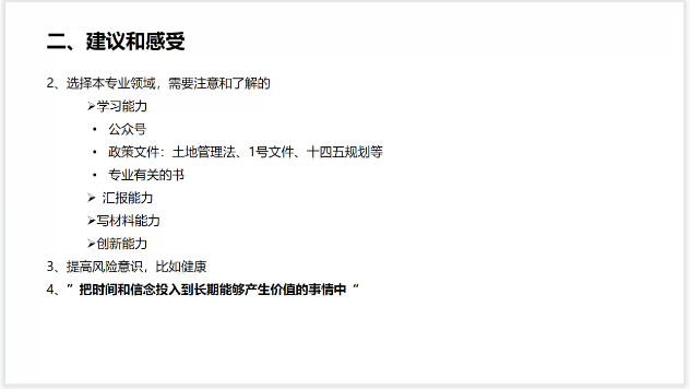 第一位进行分享的是胡正超师兄,他首先从单位及岗位情况、目前负责和参与的项目、工作状态、职业发展、三区三线永久基本农田试划等方面,向大家介绍了自己的工作情况;随后,胡正超师兄又向大家分享了一些建议和感受,包括在选择岗位时需要考虑的因素以及选择本专业领域需要具备的能力等。“把时间和信念投入到长期能够产生价值的事情中”,师兄的分享由浅入深、细致详实。