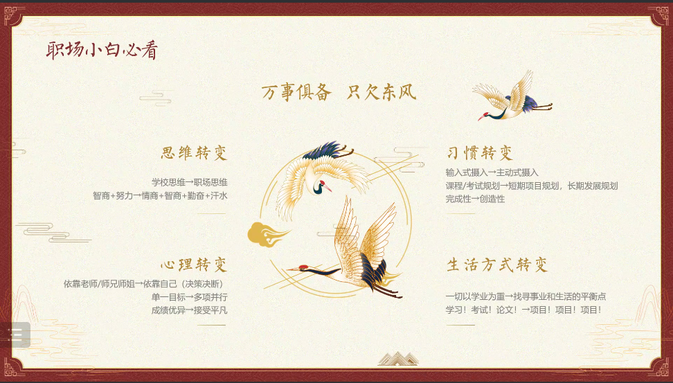 紧接着,周璐瑶师姐分享了她入职一年零十个月里的“喜”与“悲”,偶尔的连续高强度工作固然会使人身心俱疲,而自己所获的荣誉和成就所带来的喜悦也同样无可比拟。同时,师姐也从工作强度、薪资情况、晋升路径、同行认可以及知识技能等方面,分享了自己的工作日常;从思维转变、习惯转变、心理转变和生活方式转变四个方面,为职场小白们送去了在工作中起重要作用的“东风”。关注岗位的平台与发展空间,认清自我的未来规划,探索自身职业和生活的追求,师姐生动风趣的介绍为嘉宾分享环节画上了圆满的句号。