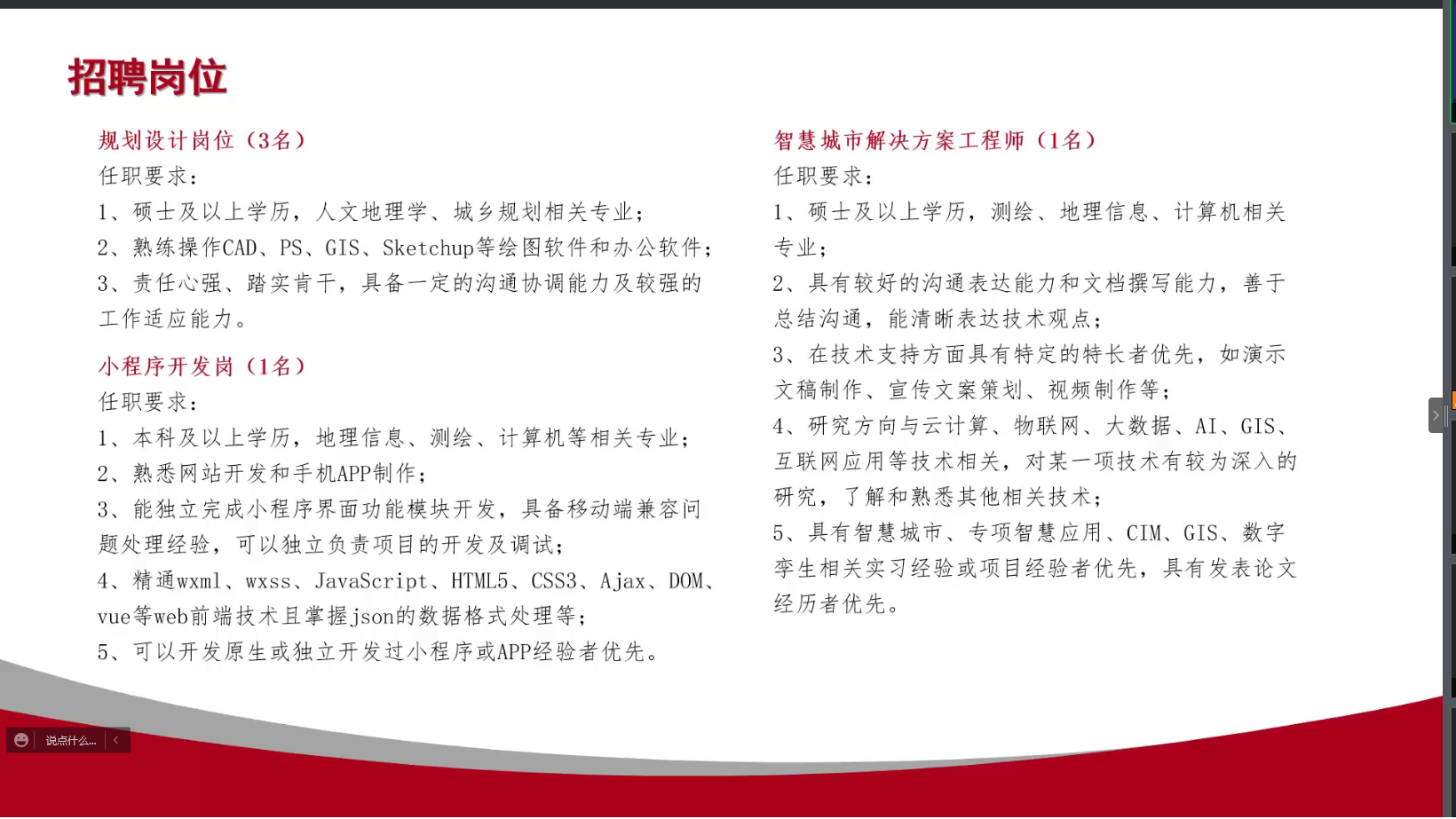 宣讲过程中,部分招聘单位精心准备了宣传视频向同学们介绍各单位情况,并留下了联系方式供同学们会后咨询和应聘。宣讲单位的招聘简章、联系方式等详细信息请点击以下链接://docs.qq.com/sheet/DTmNxUVRQcXZHWmxw