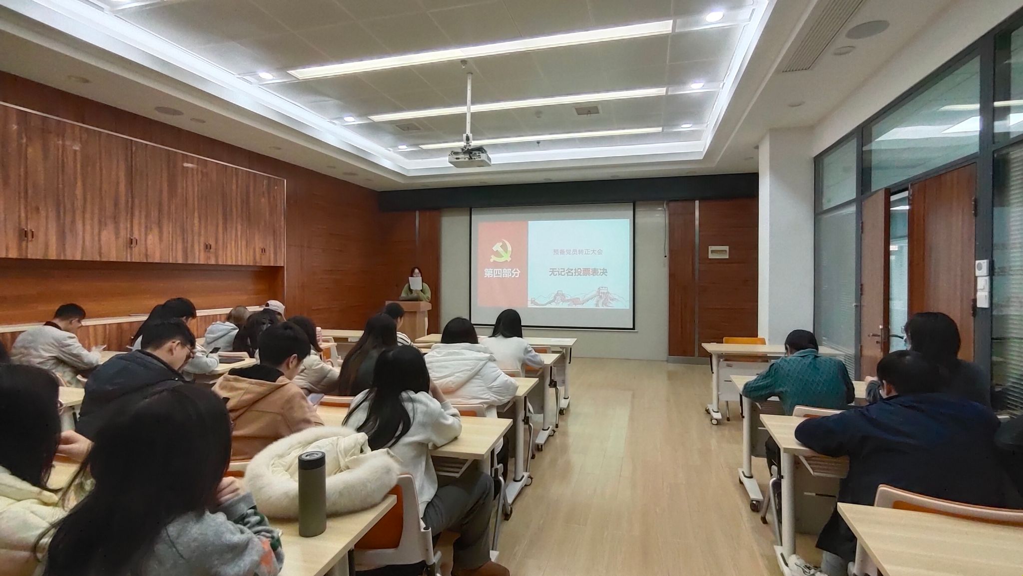 会议第一项,讨论张怡琪同志的转正问题。喻韩同志介绍了张怡琪同志思想、学习、生活情况,符合一名党员的标准,支部委员会审查后建议按期转正,提请召开支部党员大会讨论该同志的转正问题。会上,张怡琪同志向党组织汇报了自己在党员发展期间的学习收获、思想认识、在校表现等情况。经培养考察人和与会党员发表意见后,由正式党员进行无记名投票。李克诚同志和陈蓓贝同志负责本次投票的监票计票,现场公示投票结果,同意25票,反对0票,弃权0票。经表决,张怡琪同志得到党支部大会的一致认可。喻韩同志宣布支部决议,同意张怡琪同志的转正申请。