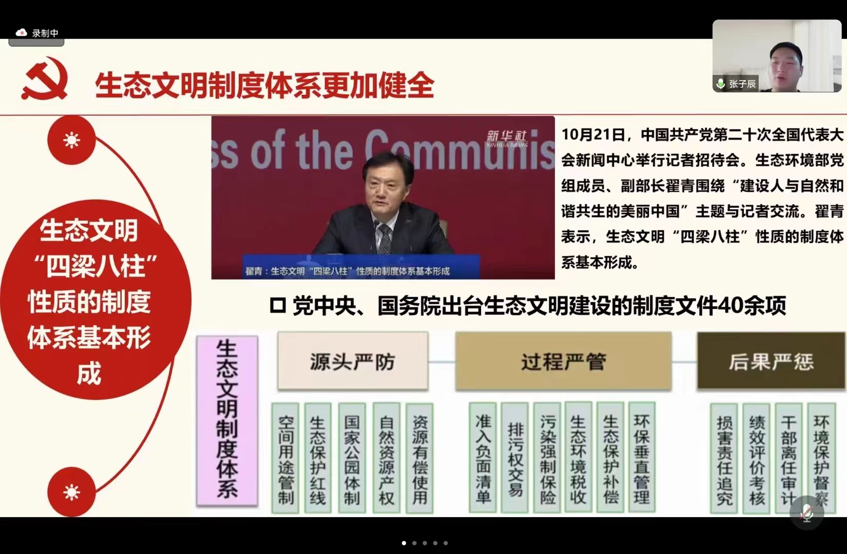 环境科学与工程系研究生第四党支部于2023年11月27日晚上7点30分以腾讯会议形式召开学习分享会暨支部组织生活会。本次会议由支部书记邓萌杰同志主持,特别邀请到清华大学环境学院博士生讲师团的张子辰同学为支部成员讲课。宣讲内容为:从党的二十大报告看我国未来生态文明建设未来发展方向。会议应到正式党员24人,实到正式党员21人,可以开会。