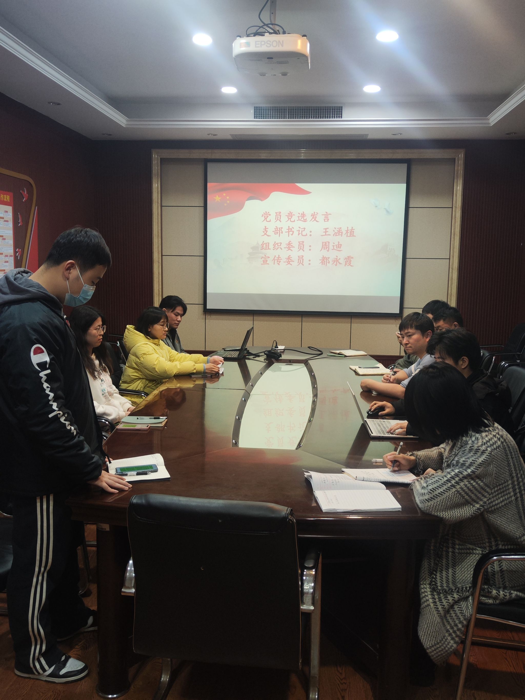 会议第二项,党员竞选发言。王子任同志公布了通过自我推荐、支部审核后的候选人名单与情况。王涵植、周迪、都永霞三位支委候选人依次介绍了个人情况并阐述了未来工作规划。王涵植同志汇报了个人工作以及实践情况,针对党支部建设、组织、宣传、纪检等方面进行规划与展望,同时王涵植同志表态将以务实的工作态度进行党支部的建设,在党员中起到榜样与表率的作用。周迪同志介绍了个人在学习与学生工作中的经验与成绩,提出了未来工作发展的希冀。都永霞同志阐述了本科期间与研究生期间所参与宣传工作情况,同时表态将以认真务实的态度做好党支部的宣传工作。