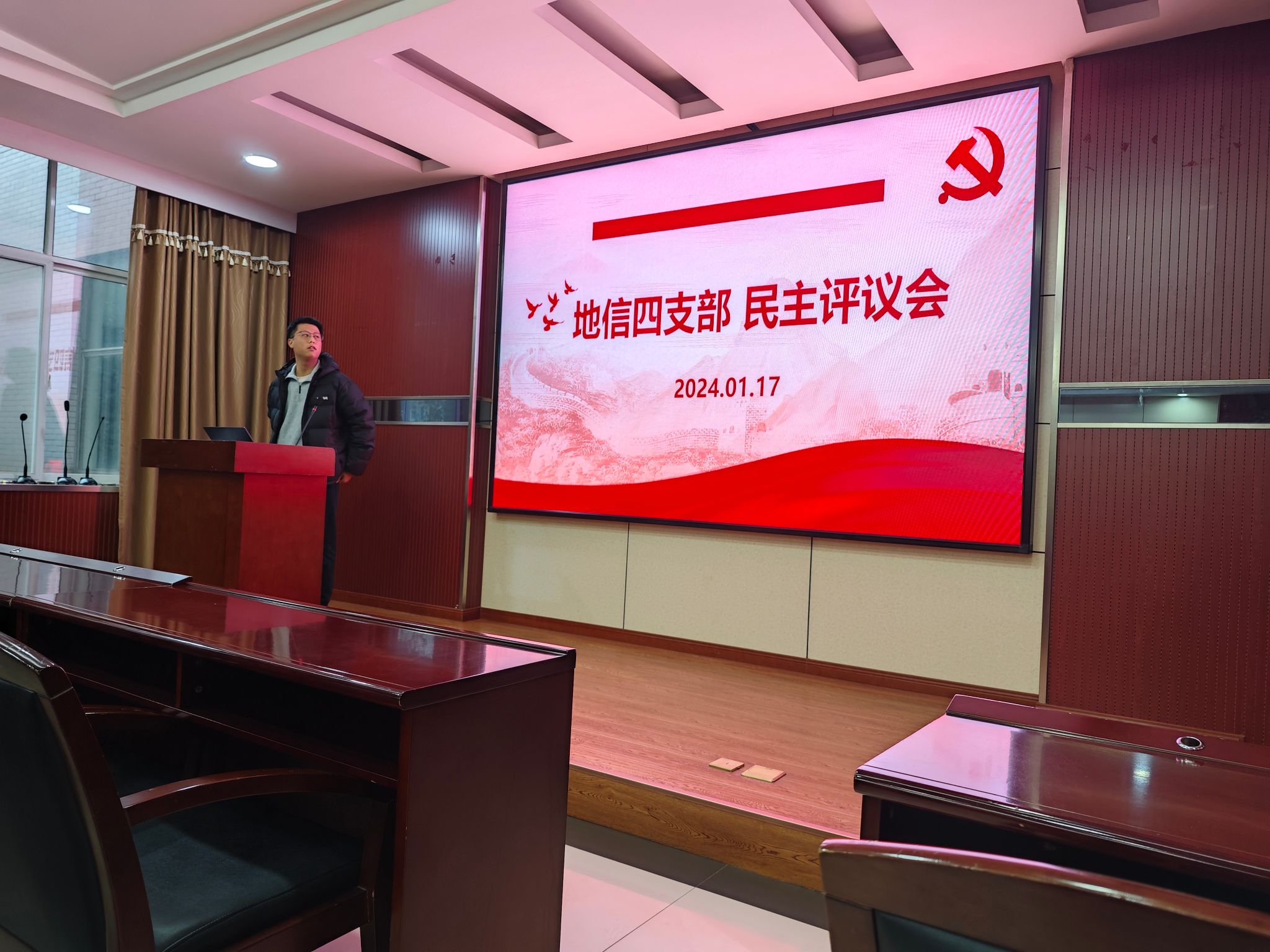 220会议室召开党支部大会进行党员民主测评暨一月主题党日活动。本次会议由党支部书记张博轩同志主持。