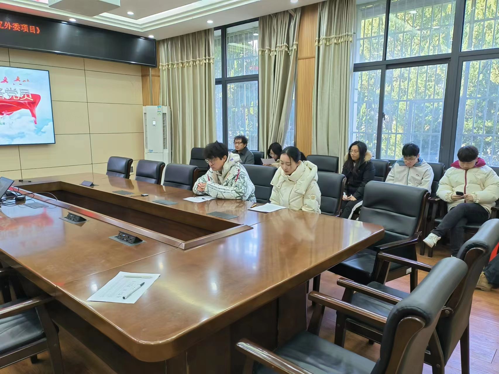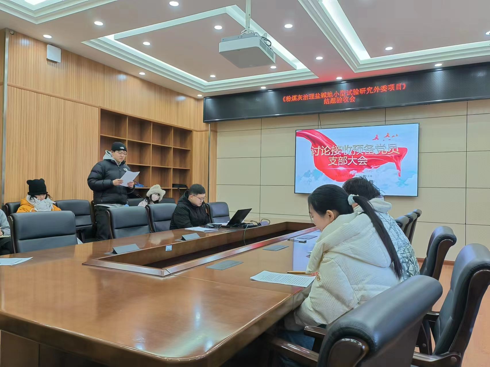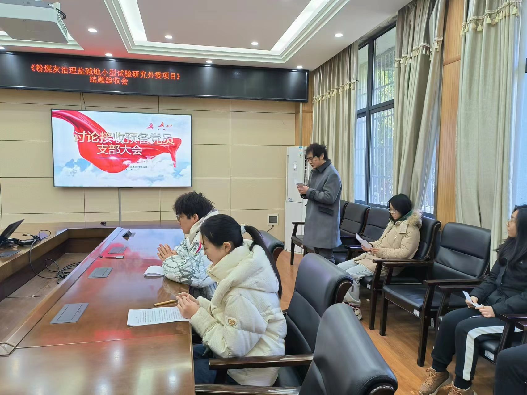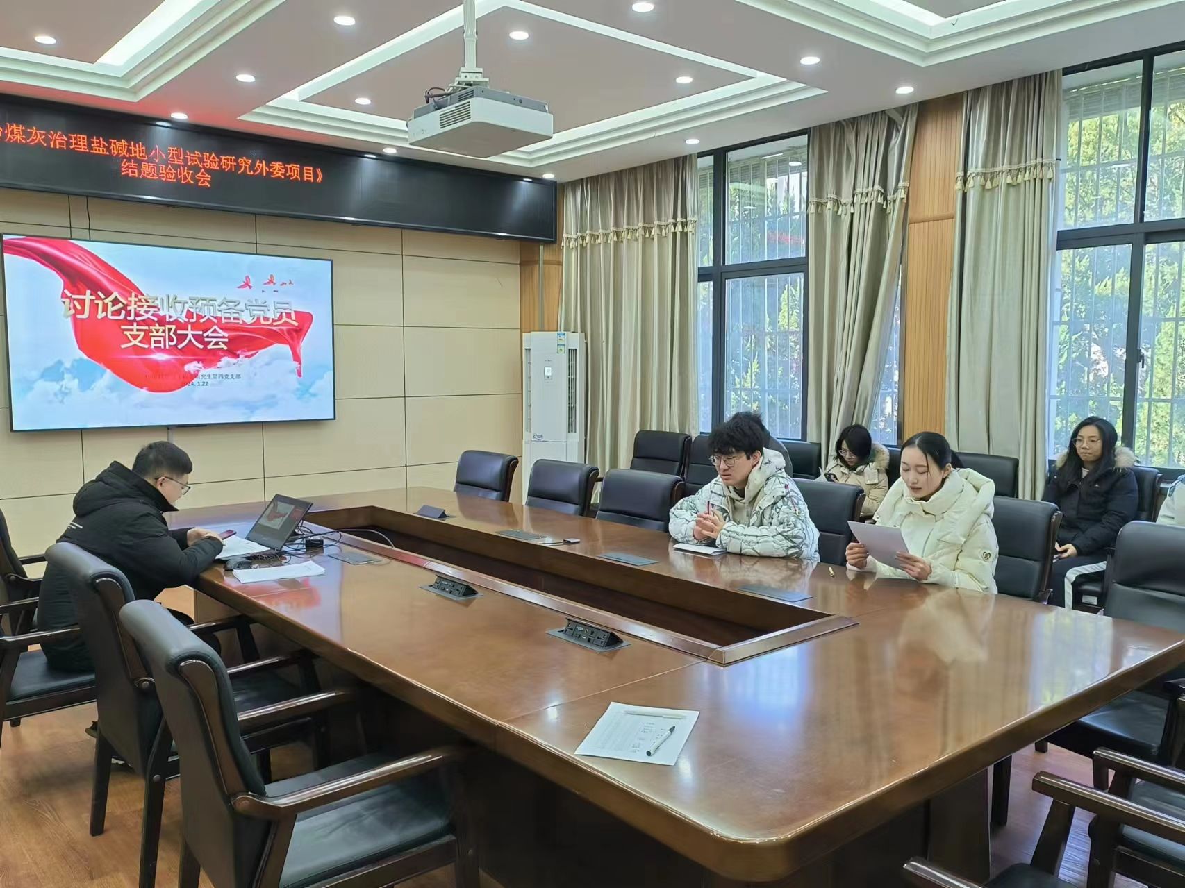 2024年1月23日上午十点,环境科学与工程系研究生第四党支部接收预备党员大会于工学部动机院212会议室召开。本次会议由支部书记邓萌杰同志主持,主要内容为戴陆明和朱珅瑾同志的预备党员接收问题。会议应到正式党员20人,预备党员6人,实到正式党员15人,预备党员2人。具有表决权的正式党员到会人数超过应到人数的一半,符合规定的人数要求,可以开会。