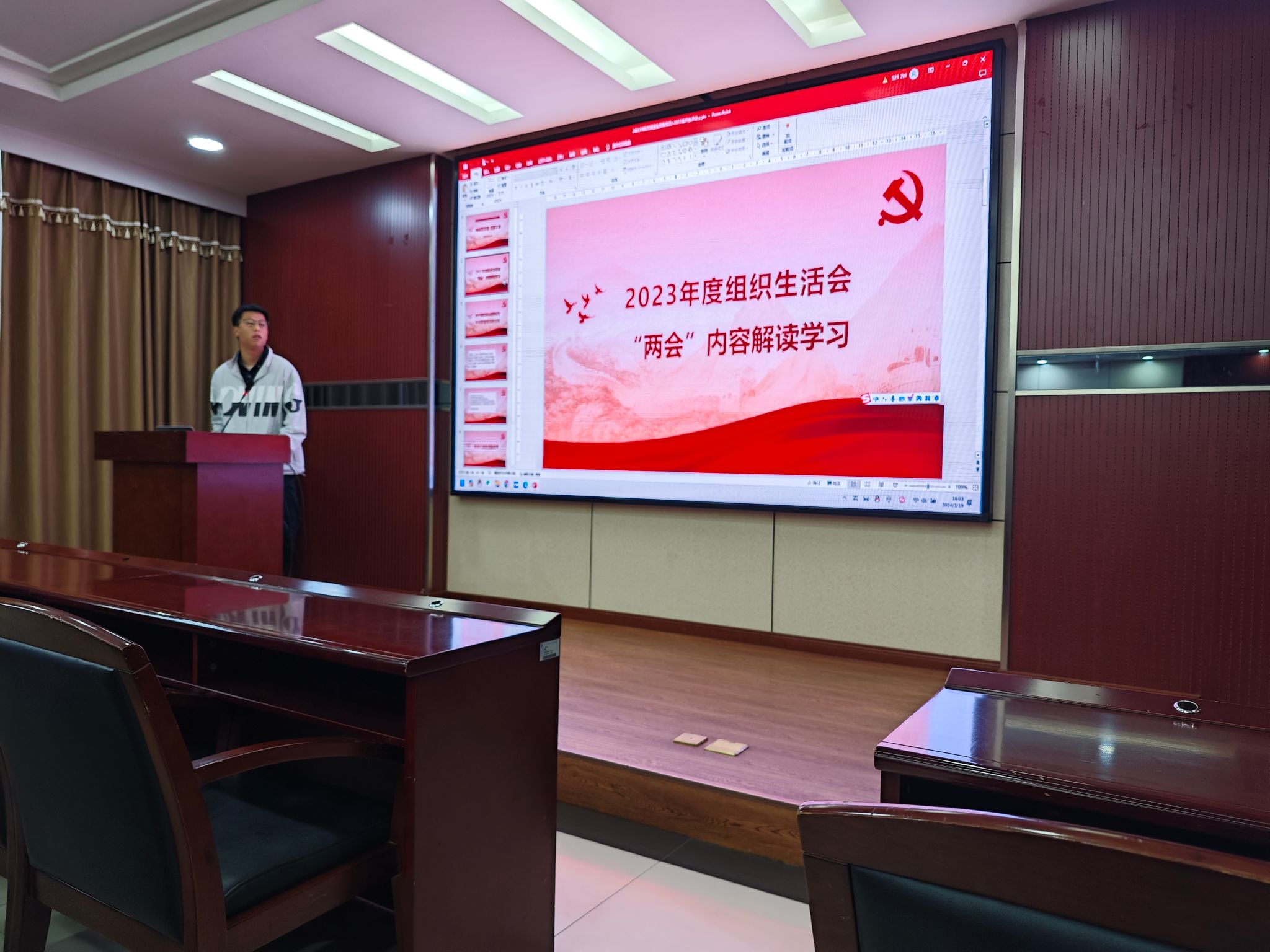 会议第二项,专题组织生活会:2024两会相关内容学习。党支部书记张博轩同志带领支部成员对“两会”内容进行学习,并观看相关视频对一些热门词汇,例如“新质生产力”,进行深层次解读。