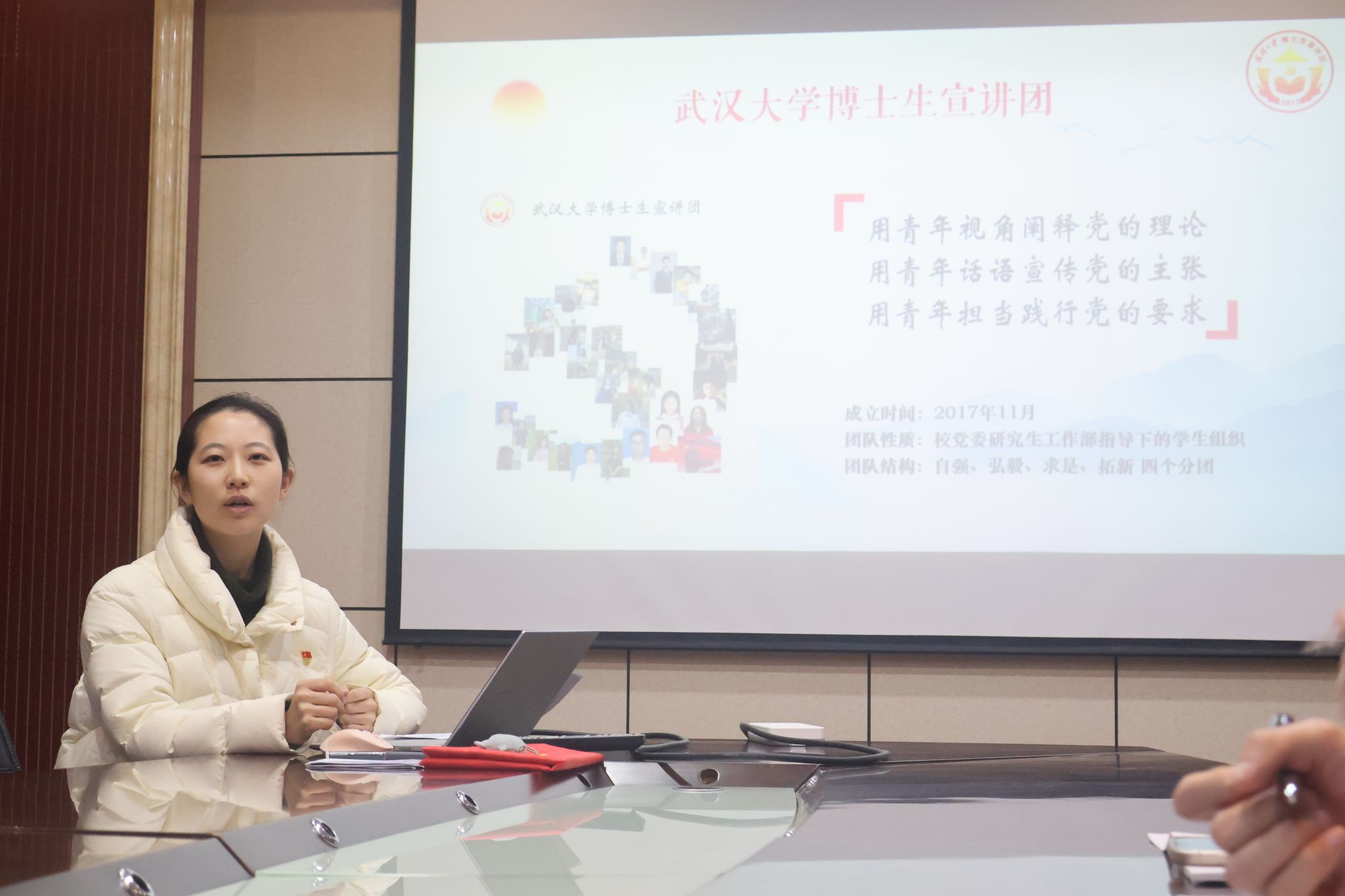 会议伊始,由博士生宣讲团成员陈乾奕同志以“教育强国路上的珞珈人”为题进行主题汇报,向我们介绍了王星拱校长在武大任教期间的一些改革措施和历史故事,宣讲团博士生精彩的汇报展示引发了支部成员的思考与共鸣。