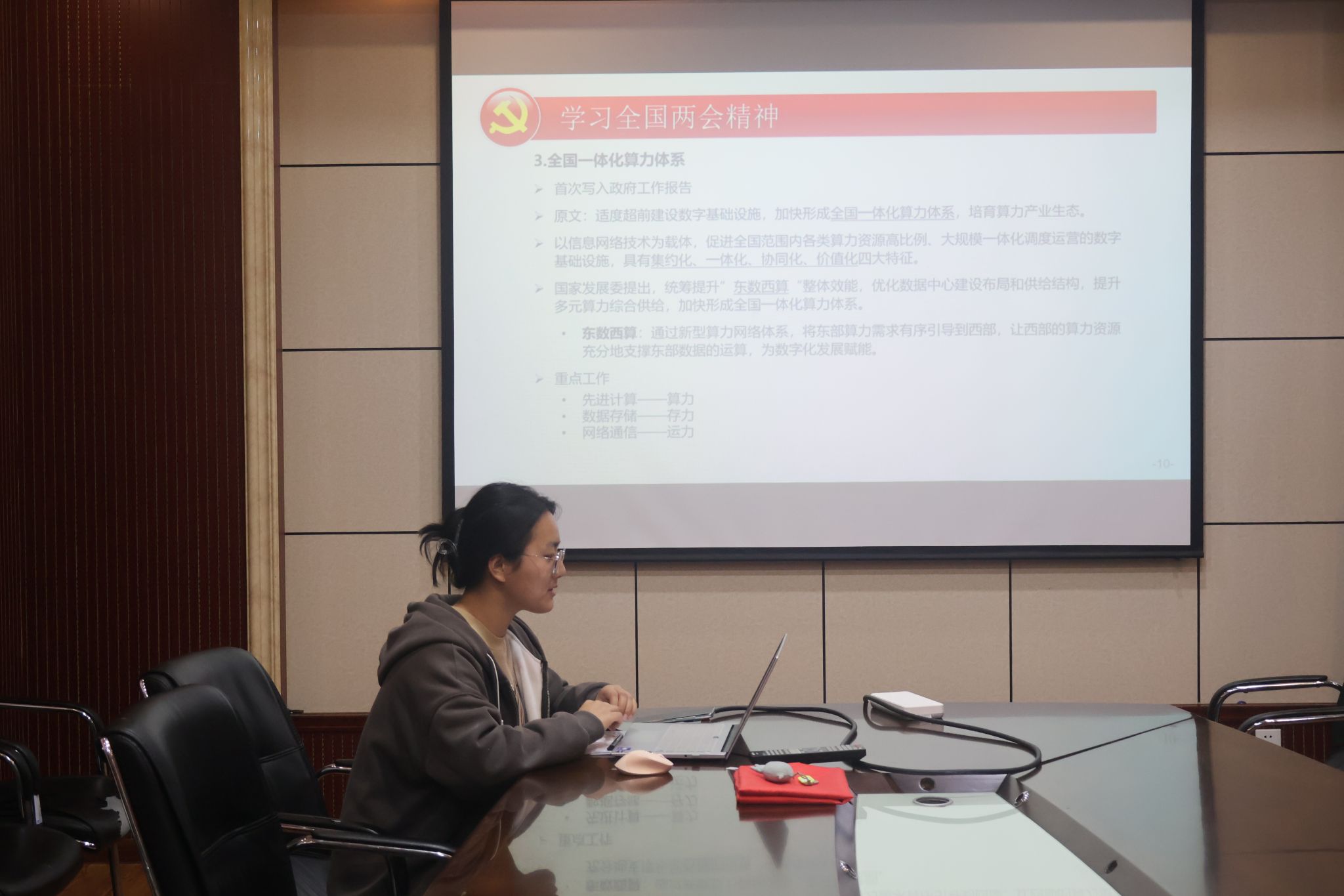 最后,由支部书记马淼同志主持开展党课知识小课堂,采用PPT和知识问答的形式,图文并茂地向支部成员传达两会精神,讲解“两会”新名词和中国共产党党徽党旗条例相关知识,支部成员在回答问题的过程中更新巩固了相关知识,并认识到了理论学习的重要性。通过党课知识的学习,党员同志更加意识到应该结合自身专业技能,发挥党员的先锋模范作用,努力成为强国路上的领头羊,更好地实现“技能成才,强国有我”这一目标。