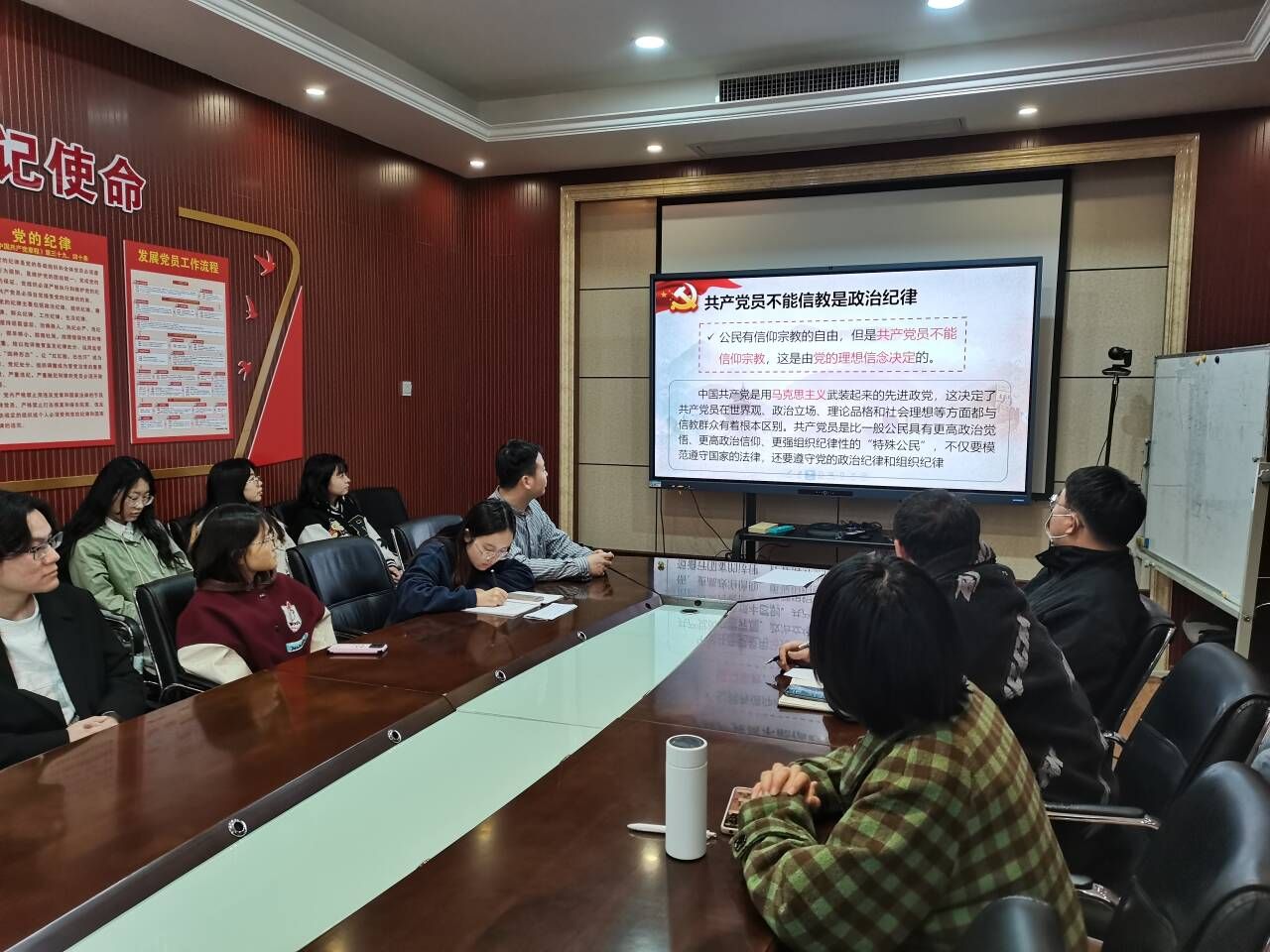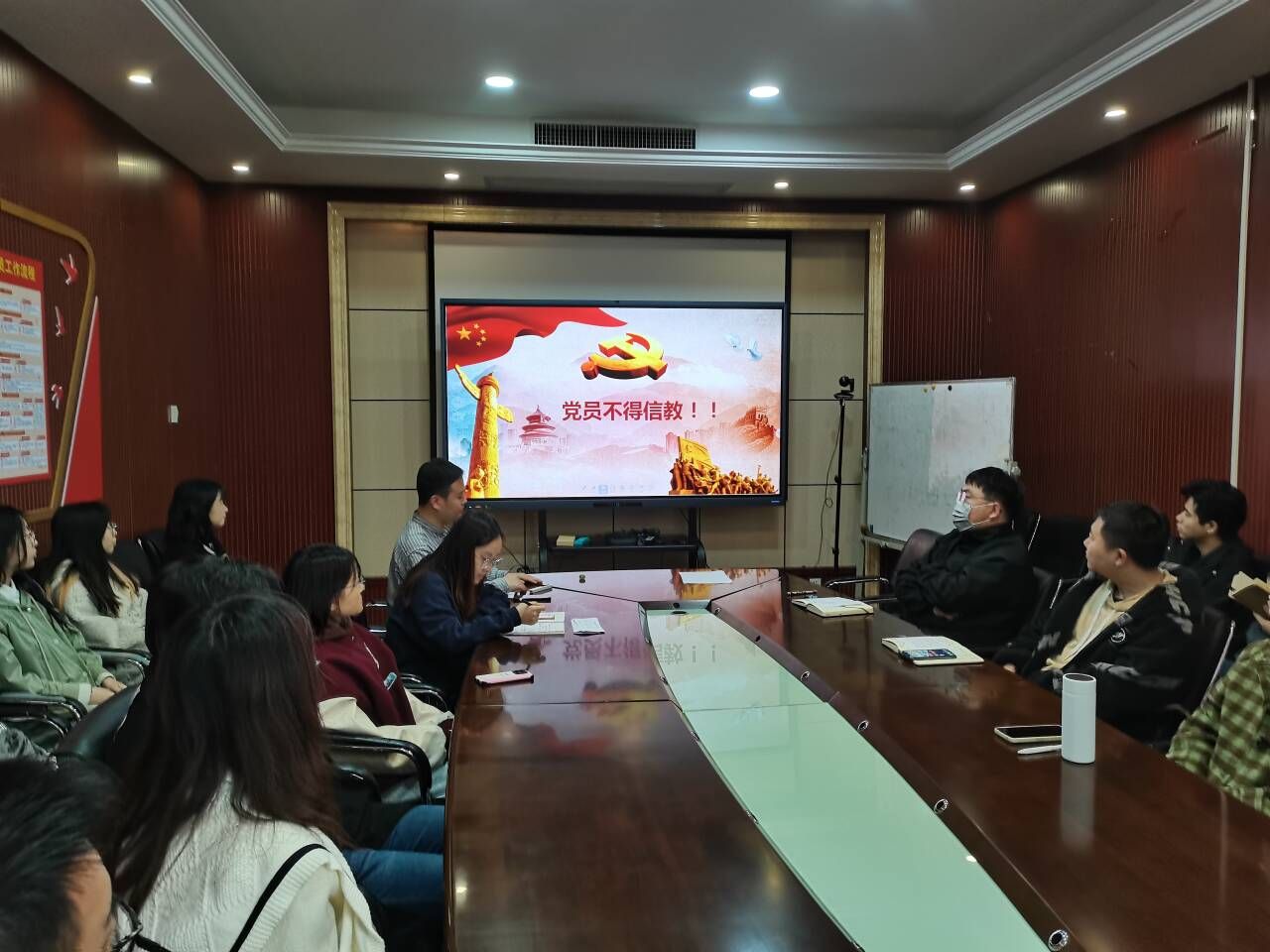 会议第一项,“党员不得信教”主题党会。党支部书记王涵植同志强调了共产党员不能信教是政治纪律,共产党员不能信仰宗教是由党的理想信念决定的。党支部书记王涵植同志向与会党员介绍了有关宗教信仰方面的党规党纪、法律法规以及相关案例警示,并教育与会党员要牢记党员身份是第一身份,严守纪律、树立党员的良好形象。介绍完毕后,由王涵植同志带领大家观看了央视新闻关于宗教工作的系列视频。