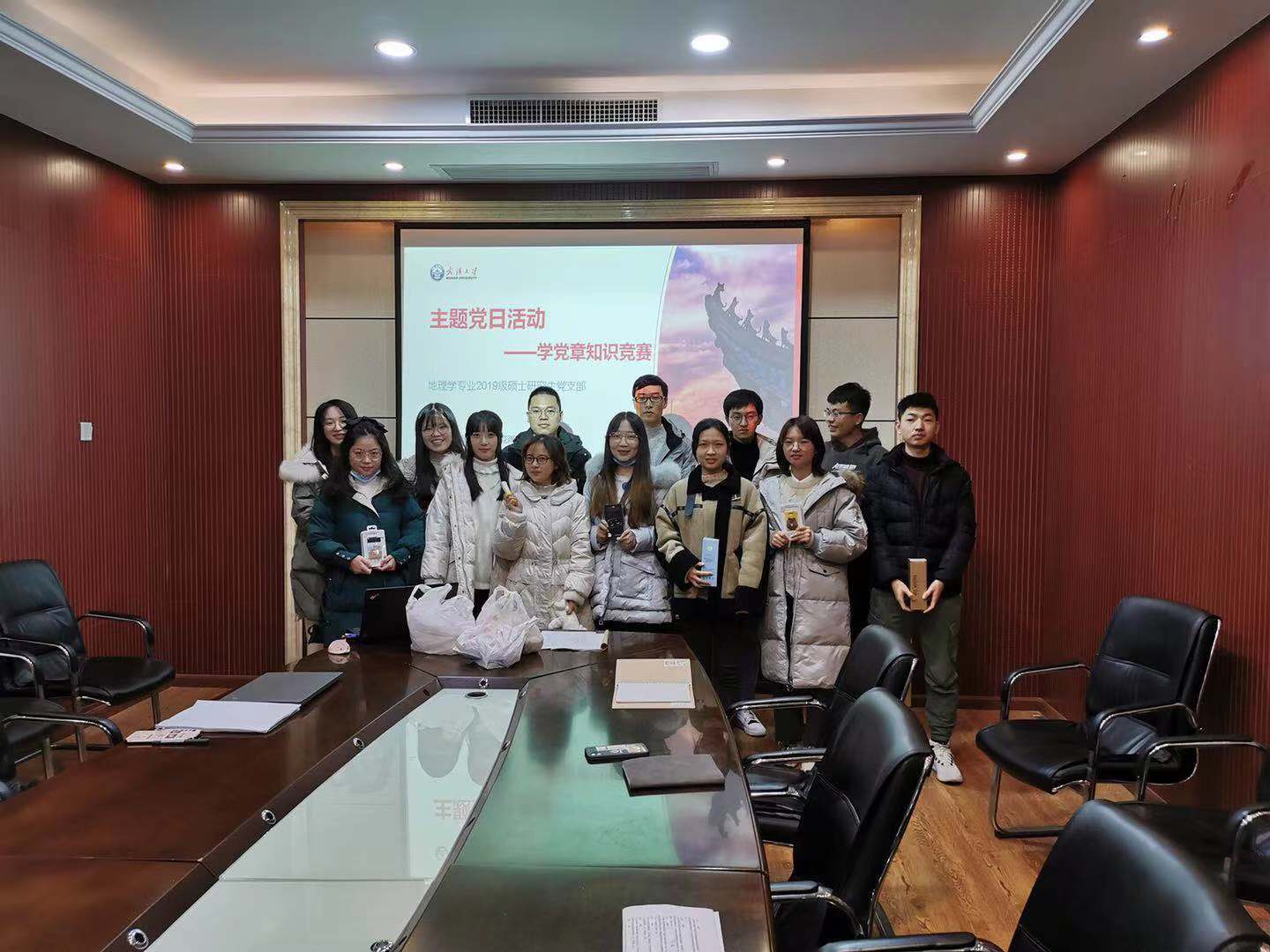 根据学校党委《关于巩固深化“不忘初心、牢记使命”主题教育成果重点任务工作方案》,党支部每年要组织1次党章专题学习交流。地理学专业2019级硕士研究生党支部于12月14日15:00在学院504会议室开展以《“不忘初心,牢记使命学党章知识竞赛”》为主题的党日活动,深入学习党章。为鼓励支部成员及群众积极参与本次活动,支部采用知识竞赛的形式,设置一等奖1名,二等奖2名,3等奖3名,优胜奖若干并颁发奖品。