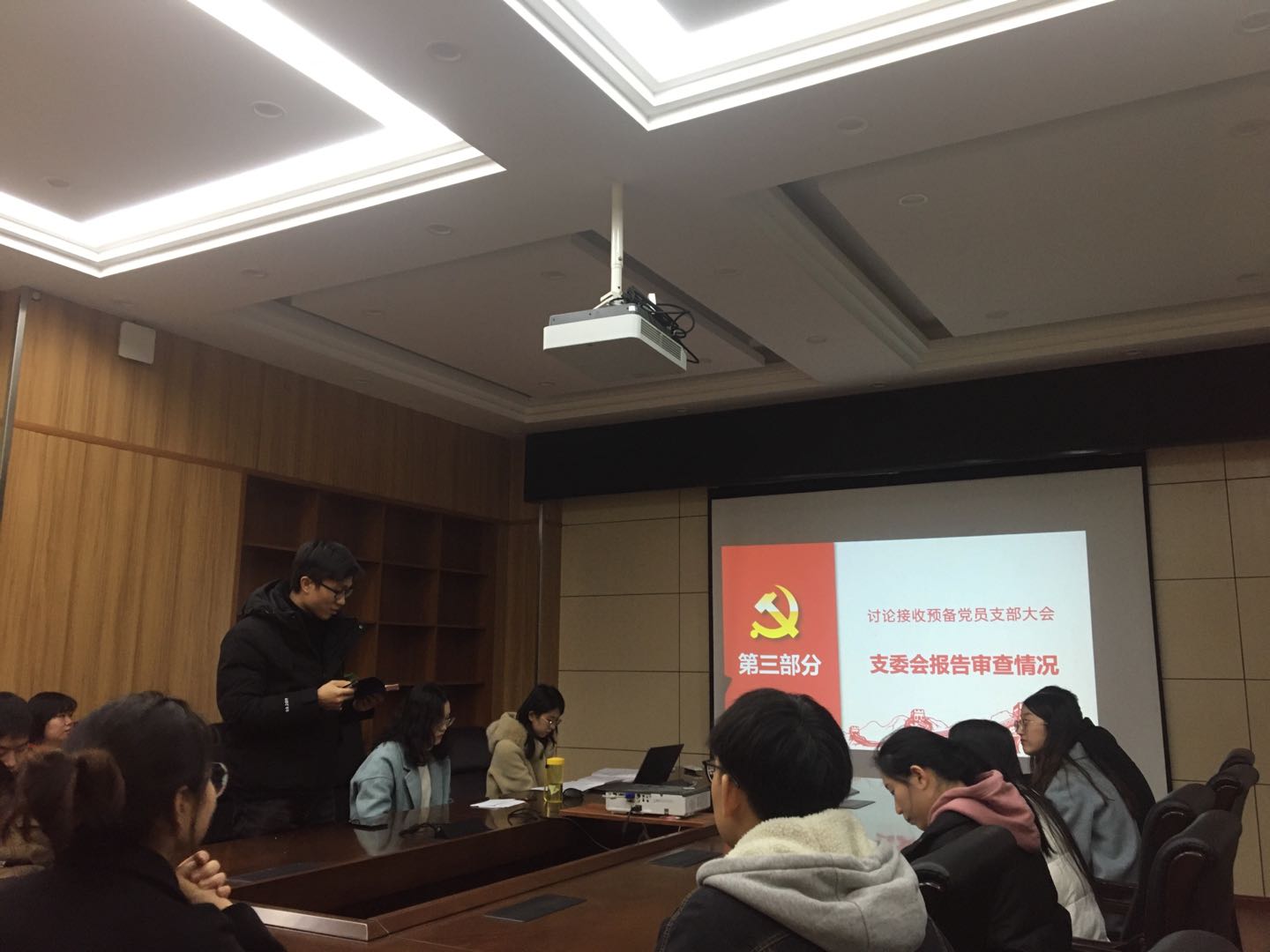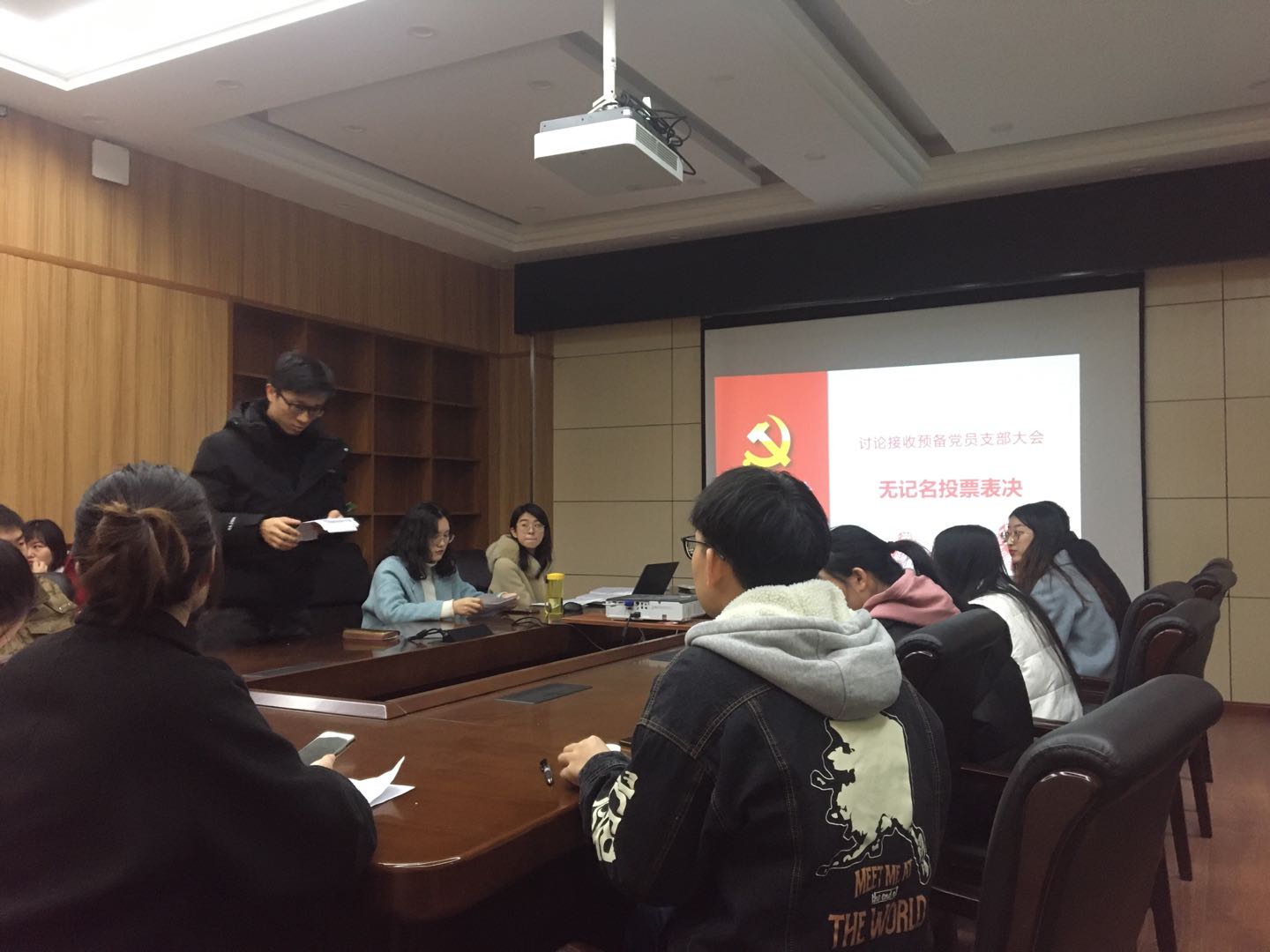 党支部书记王豪杰同志代表支委会向大会报告了对两位同志的考察情况以及综合政治材料审查情况,与会的党员对以上两位发展对象是否符合预备党员条件发表了意见。由宣传委员张金瑶同志和纪律委员雷晓薇同志担任计票人和监票人,以正式党员无记名投票方式对发展对象进行投票并现场逐一公布投票结果。最终通过一致表决,两位同志皆以14票同意、0票否决、0票弃权的投票情况接收两位同志为预备党员。