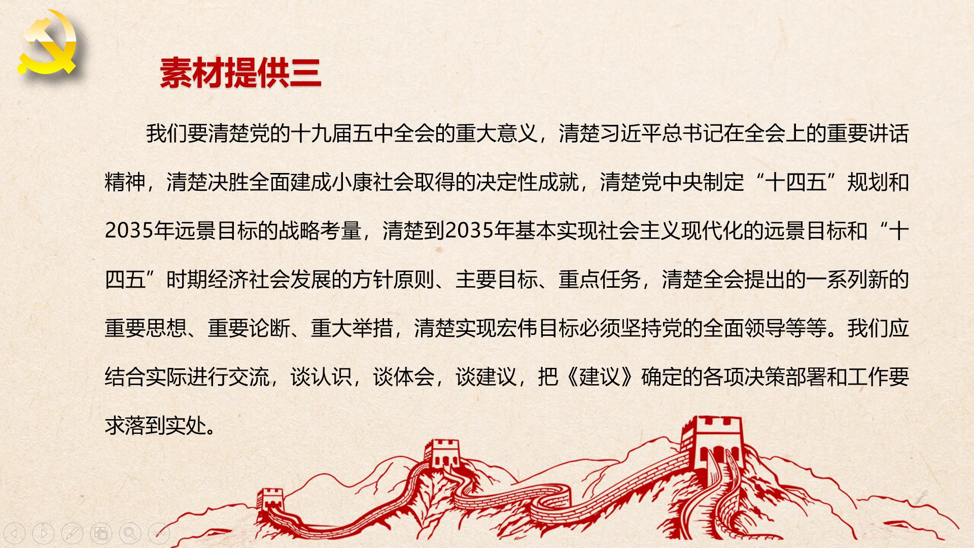 接着,刘家男对近期的素材进行梳理,主要包括围绕巩固深化“不忘初心、牢记使命”主题教育成果,开展一次党支部主题党日活动,重点学习中共中央办公厅《关于巩固深化“不忘初心、牢记使命”主题教育成果的意见》;深入贯彻落实习近平总书记在纪念中国人民志愿军抗美援朝出国作战70周年大会上的重要讲话精神,深入开展“四史”学习教育,大力弘扬伟大的抗美援朝精神,加强新时代爱国主义教育;学习贯彻党的十九届五中全会精神,要清楚党的十九届五中全会的重大意义,清楚习近平总书记在全会上的重要讲话精神,清楚决胜全面建成小康社会取得的决定性成就,清楚党中央制定“十四五”规划和2035年远景目标的战略考量,清楚到2035年基本实现社会主义现代化的远景目标和“十四五”时期经济社会发展的方针原则、主要目标、重点任务,清楚全会提出的一系列新的重要思想、重要论断、重大举措,清楚实现宏伟目标必须坚持党的全面领导等等。
