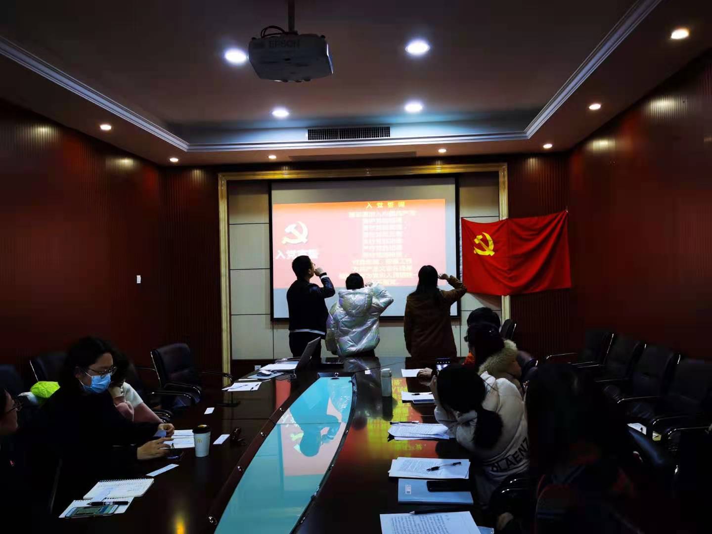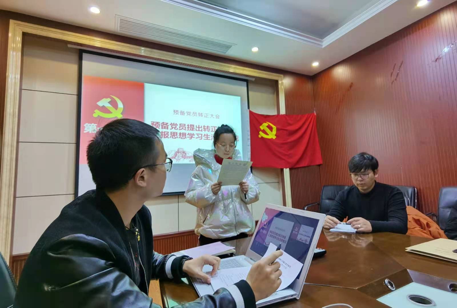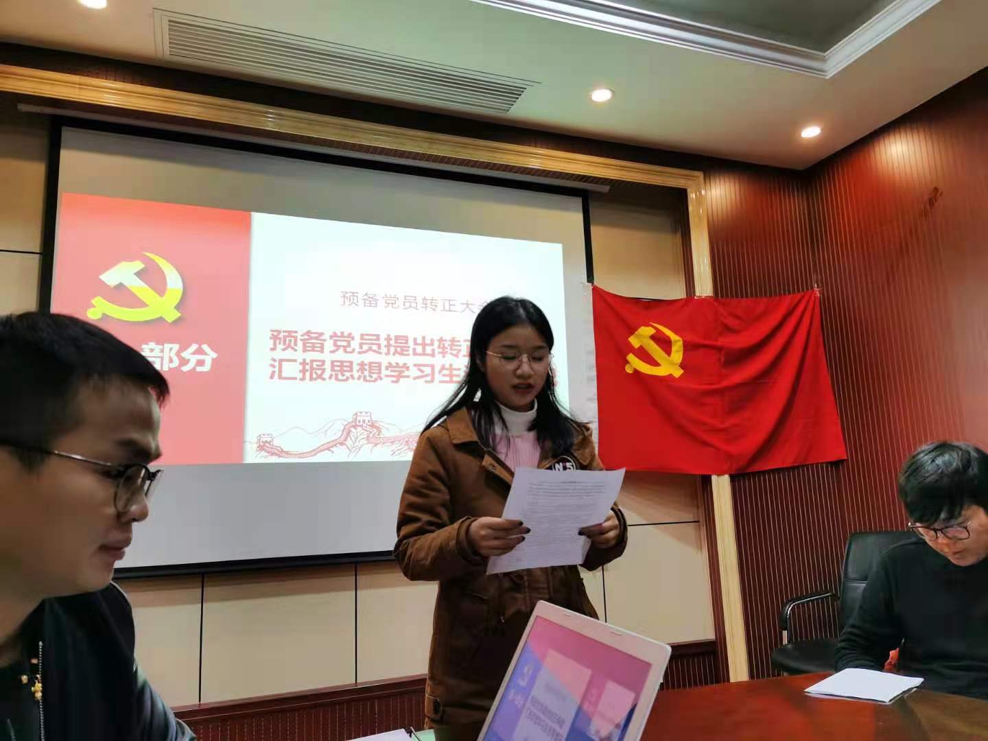 会议第一项,讨论预备预备党员曹诗翊和胡慧同志的转正申请。首先,曹诗翊和胡慧两名预备党员相继宣读转正申请书,汇报预备期中自己在思想,生活,工作等各方面的情况。再由培养人介绍相应预备党员培养考察情况。随后,大会对两位预备党员的转正议题进行讨论。在此过程中,参会的党员对其了解的两位预备党员相继发表了自己的看法,表明态度,也指出了其不足之处。随后由正式党员进行不记名投票,支部书记杨晨点票并宣读大会决议,曹诗翊和胡慧两名预备党员全票通过成为中共正式党员。紧接着由支部书记杨晨带领大家宣读了入党誓词。