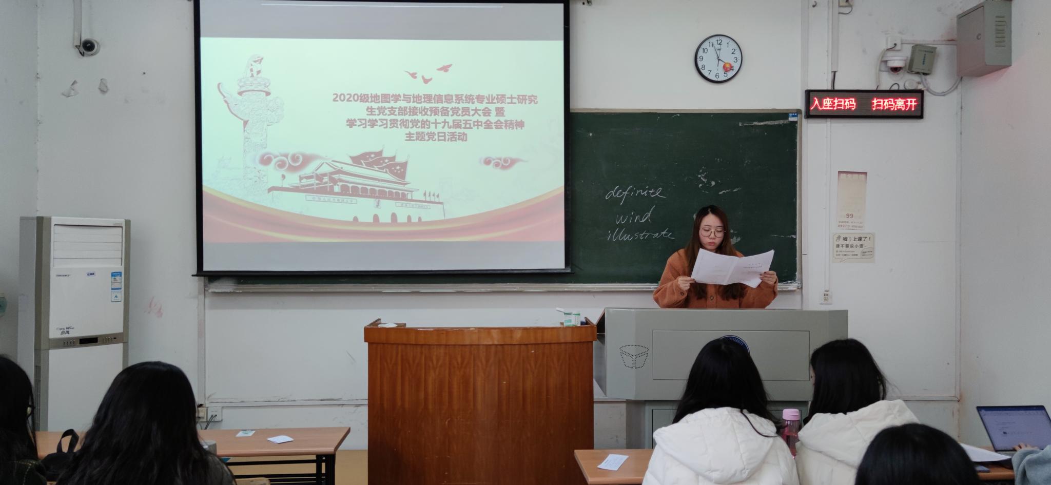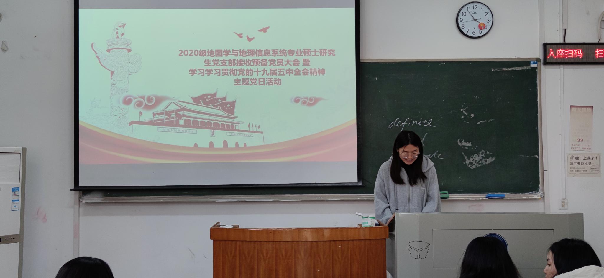 2020年12月4日周五下午四点,2020级地图学与地理信息系统专业硕士研究生党支部预备党员转正大会暨学习贯彻党的十九届五中全会精神主题党日活动于一教330召开,会议讨论并通过了赵冲同志按期转为正式党员的申请。本次会议由支部书记包雨睿同志主持,本次会议应到正式党员11人,预备党员3人;实到正式党员10人,预备党员2人,请假2人。此外,入党申请人、入党积极分子、发展对象也参与了此次会议。