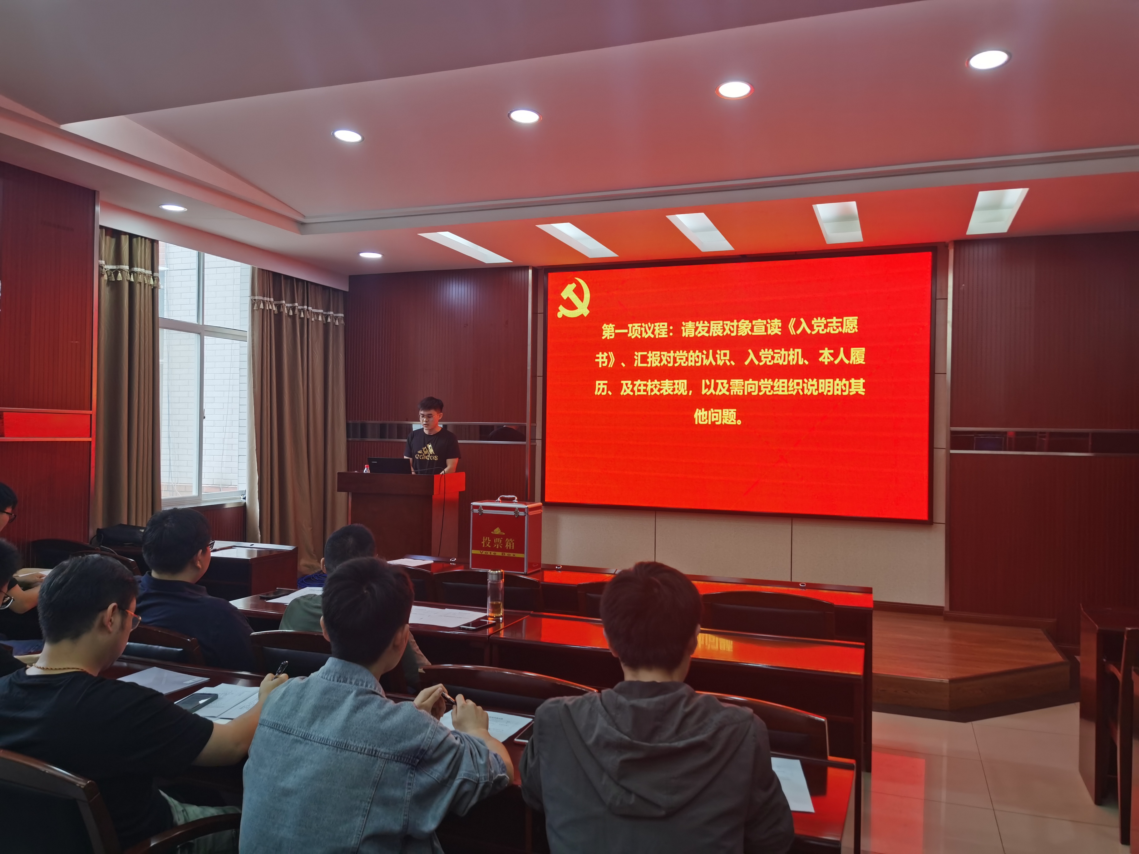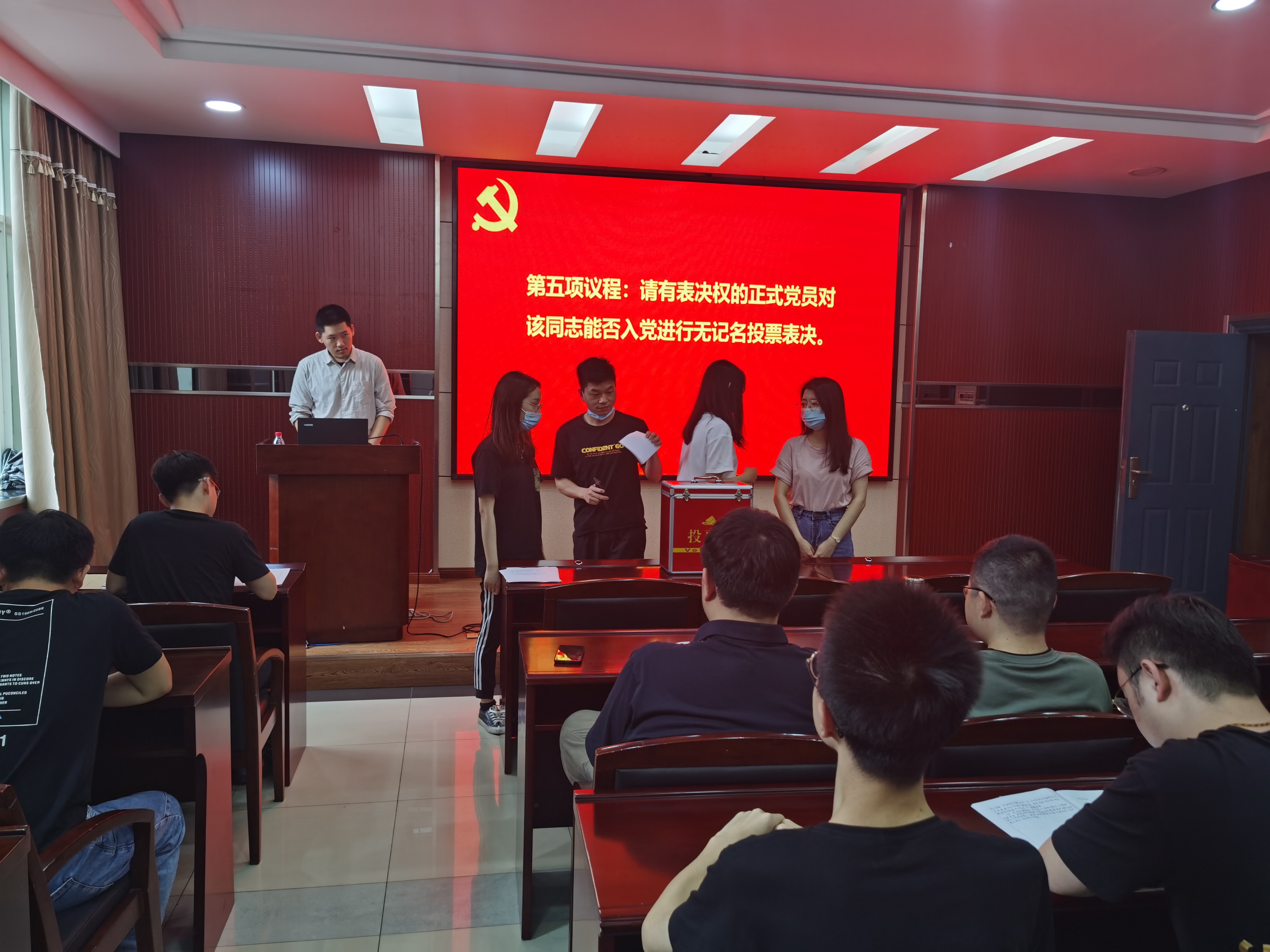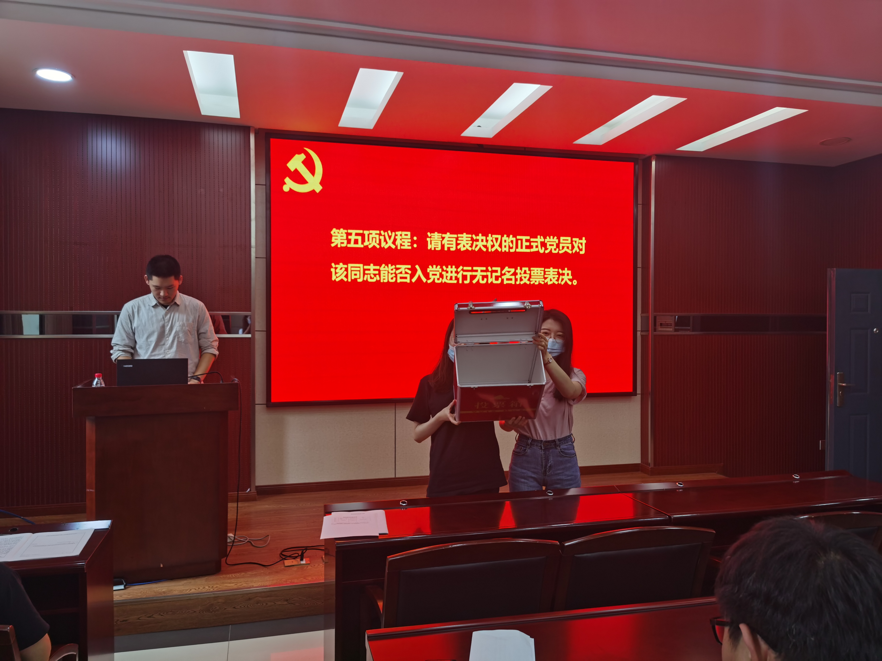 220会议室召开了讨论接收预备党员的支部大会,该会由本支部组织委员石昊同志组织,讨论表决发展对象李鹏同志和杨航启同志的入党问题。本次会议由本支部党员以及发展对象一同参加,其中应到会正式党员28名,应到预备党员6名,实到会正式党员15名。