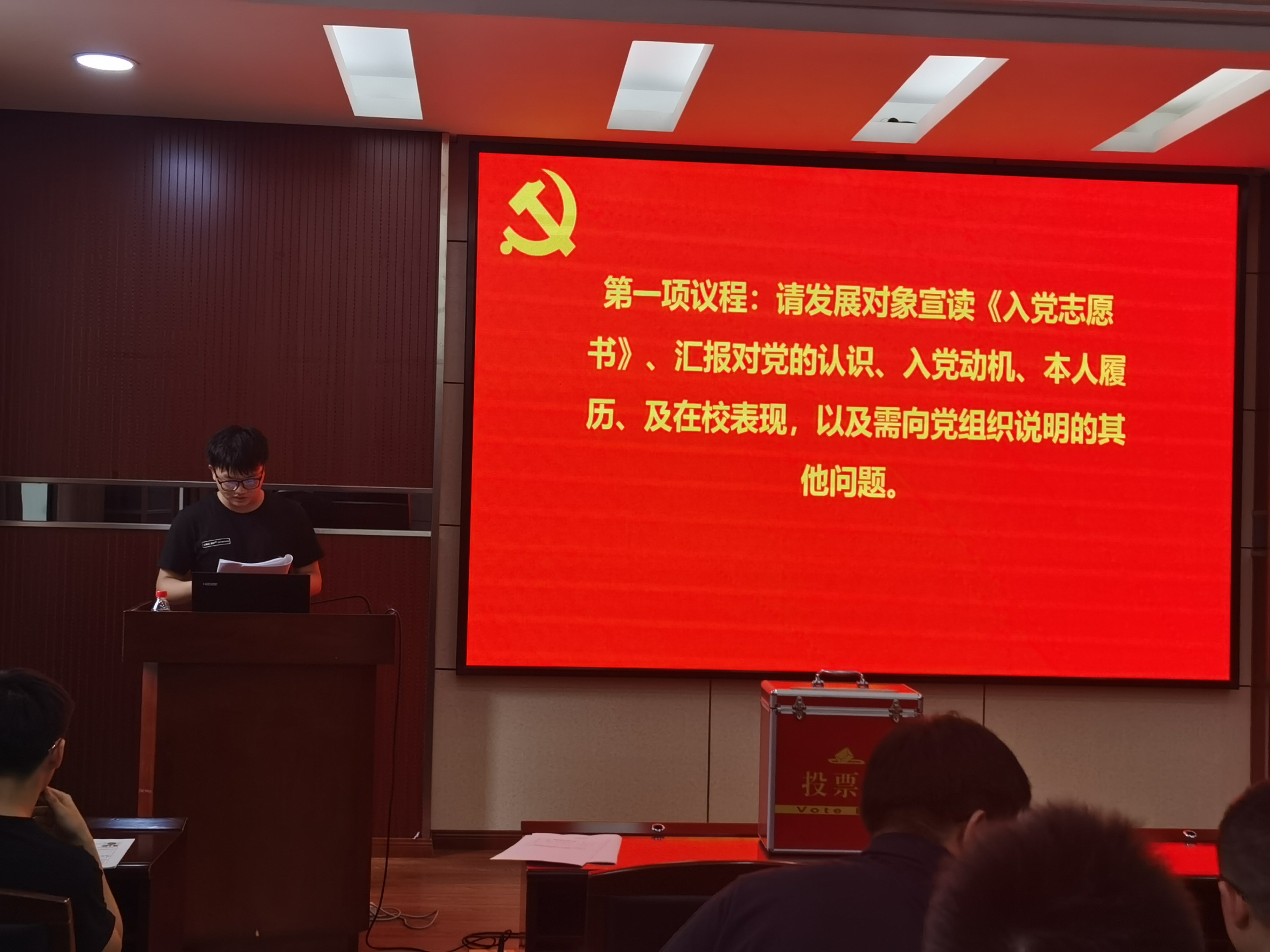 会议第一项,李鹏和杨航启两名发展对象分别宣读《入党志愿书》,汇报对党的认识、入党动机、本人履历及在校表现,以及需要向党组织说明的其他问题。