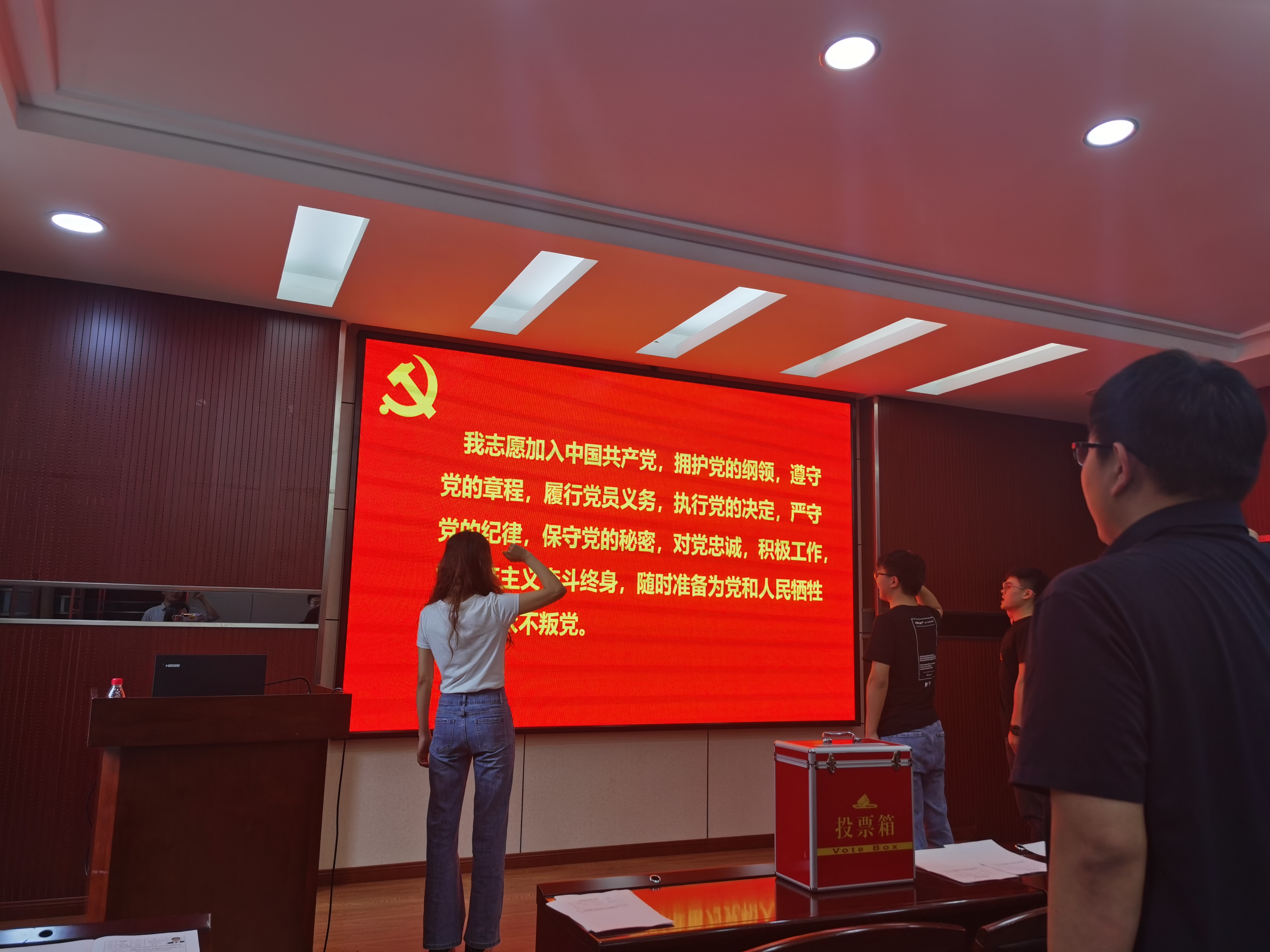 主持人石昊同志宣布决议,同意接收李鹏和杨航启同志为中共预备党员,并且由党支部宣传委员徐笑琪同志领读誓词宣誓。会议最后两位同志分别进行了表态,表示会继续努力,不断提升自己。